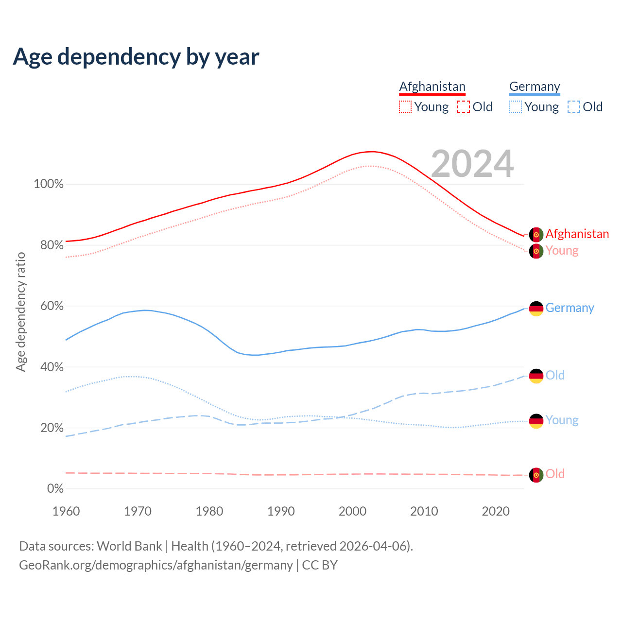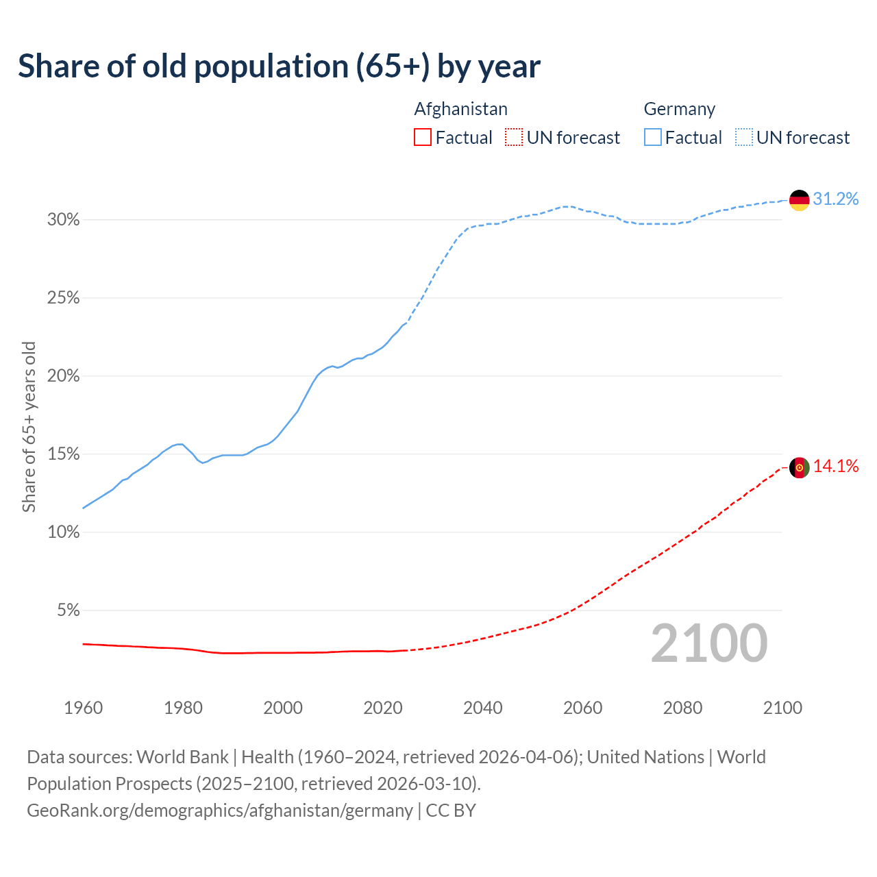The share of older people aged 65 and over is 2.4% in Afghanistan and 23.2% in Germany. Life expectancy in Afghanistan compared to Germany .
