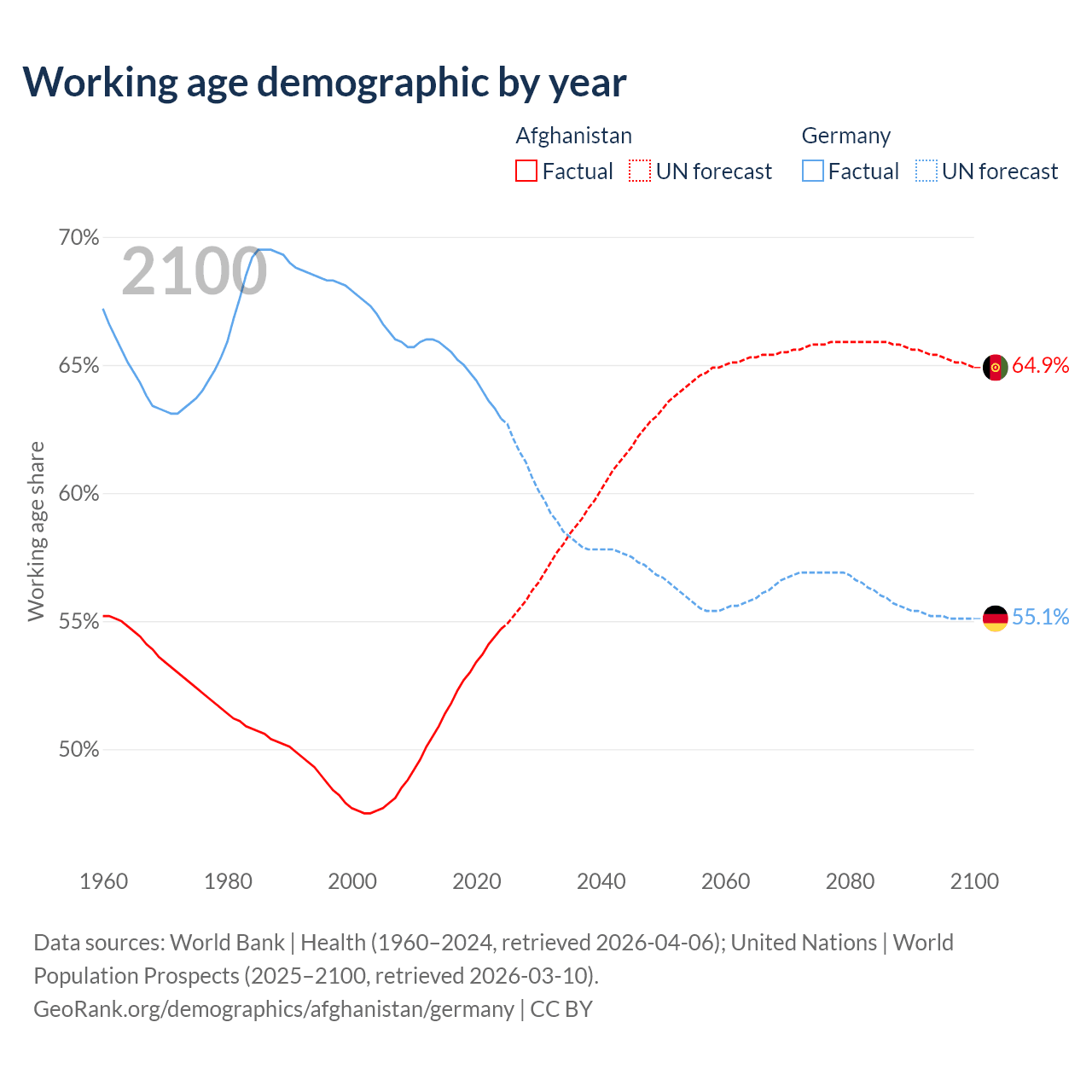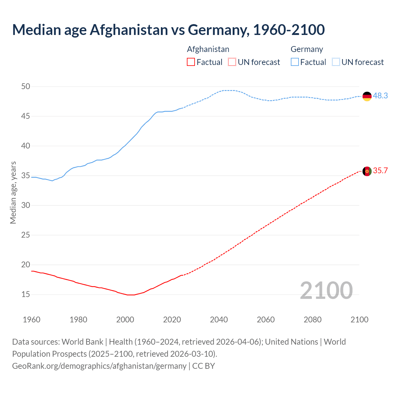 Median age Afghanistan vs Germany, 1960-2100