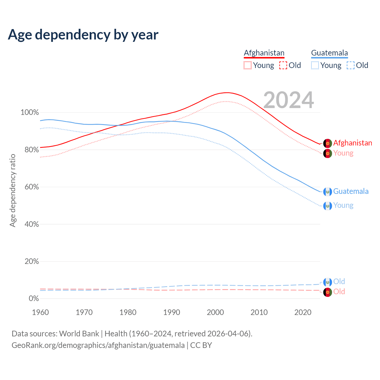 Data sources: World Bank | Health (1960–2024, retrieved 2026-04-06); U.S. Census Bureau (1960–2024, retrieved 2026-02-08).