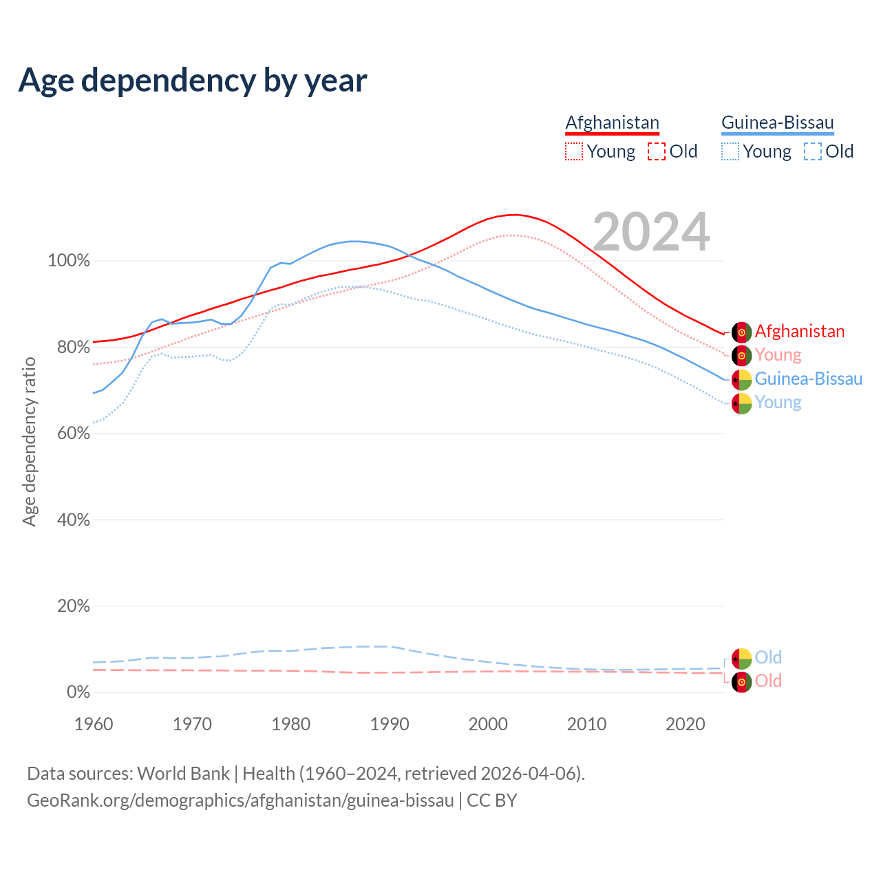 - The share of old-age demographic (65+) in Afghanistan is 2.4% vs 3.19% in Guinea-Bissau.