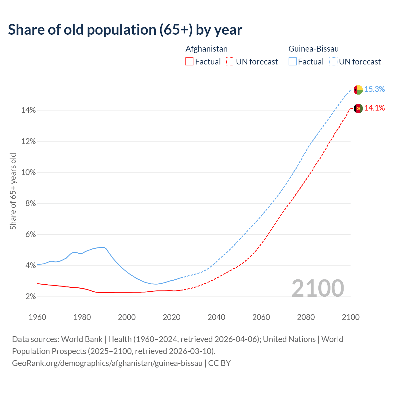 The share of older people aged 65 and over is 2.4% in Afghanistan and 3.19% in Guinea-Bissau. Life expectancy in Afghanistan compared to Guinea-Bissau .