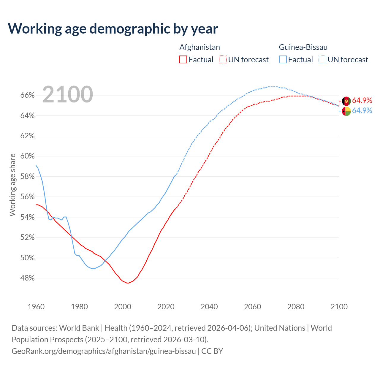 - Afghanistan has 24.8M working age adults (aged 15-64) vs 1.34M in Guinea-Bissau.