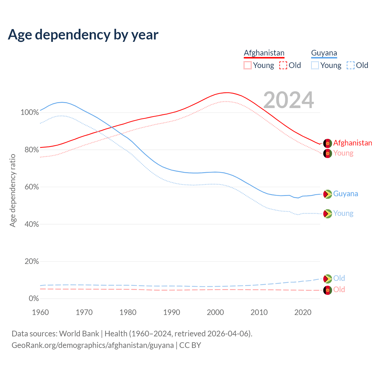 - The share of old-age demographic (65+) in Afghanistan is 2.4% vs 6.73% in Guyana.