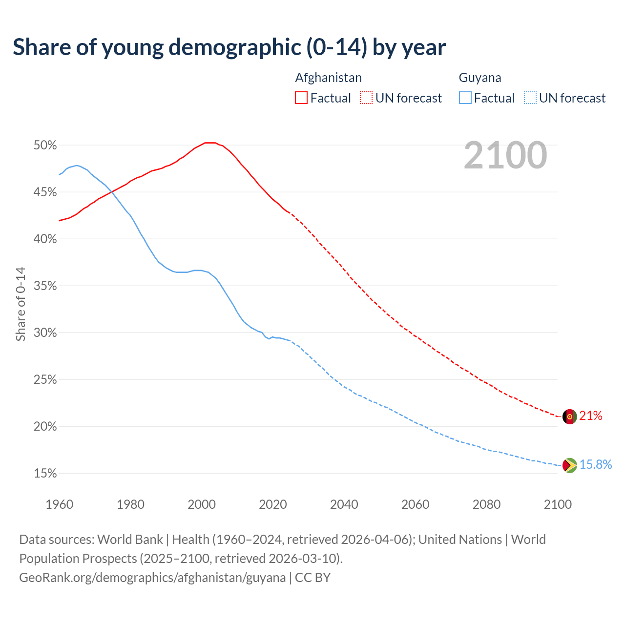 - The share of young demographic (0-15 years old) in Afghanistan is 42.9% vs 29.2% in Guyana.