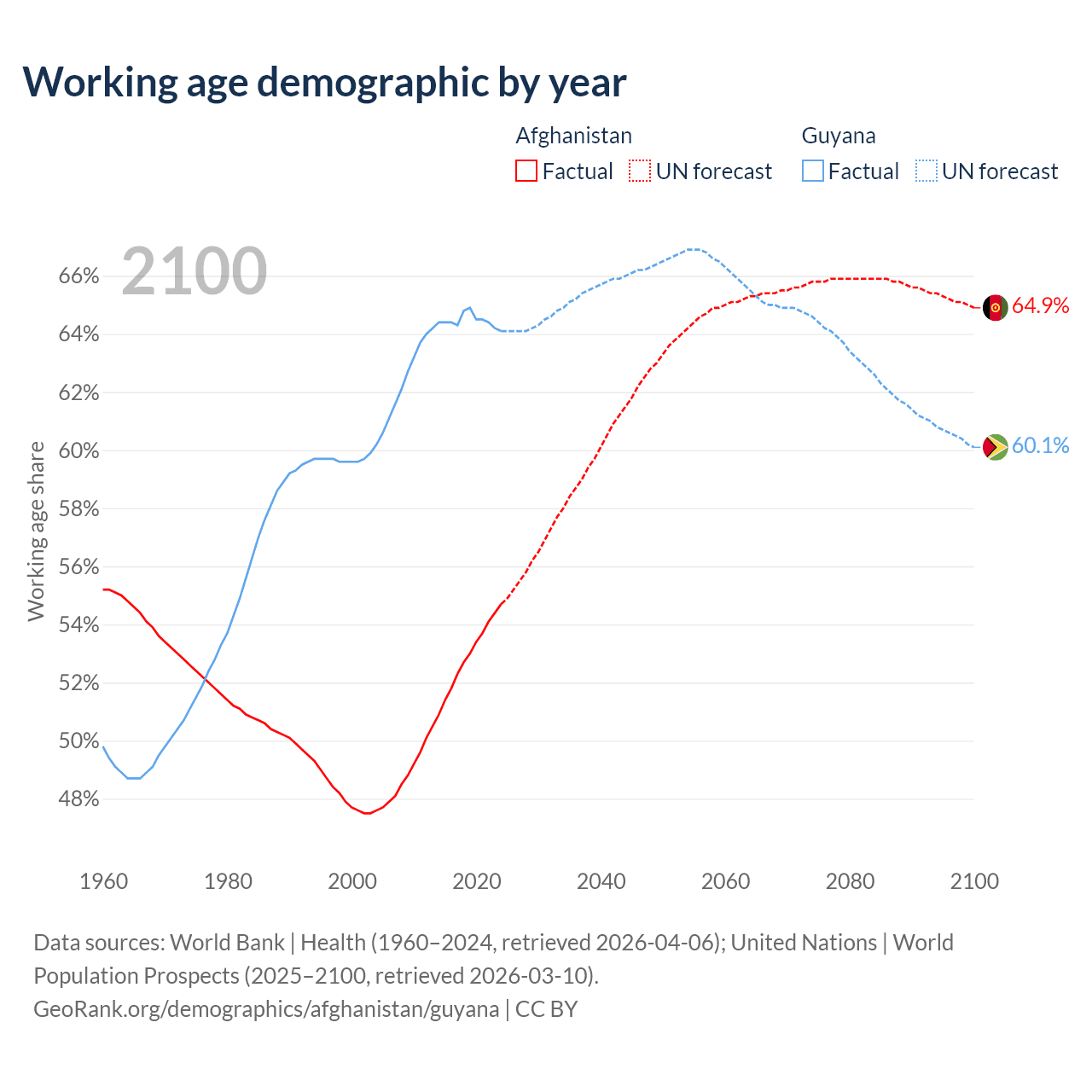 Median age Afghanistan vs Guyana, 1960-2100