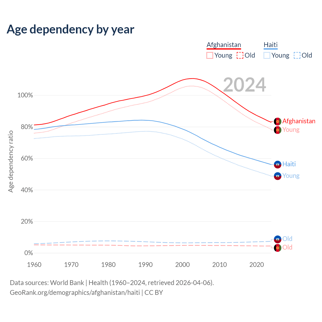 - Afghanistan is ranked 186/196 by median age (oldest to youngest) vs 135/196 for Haiti.