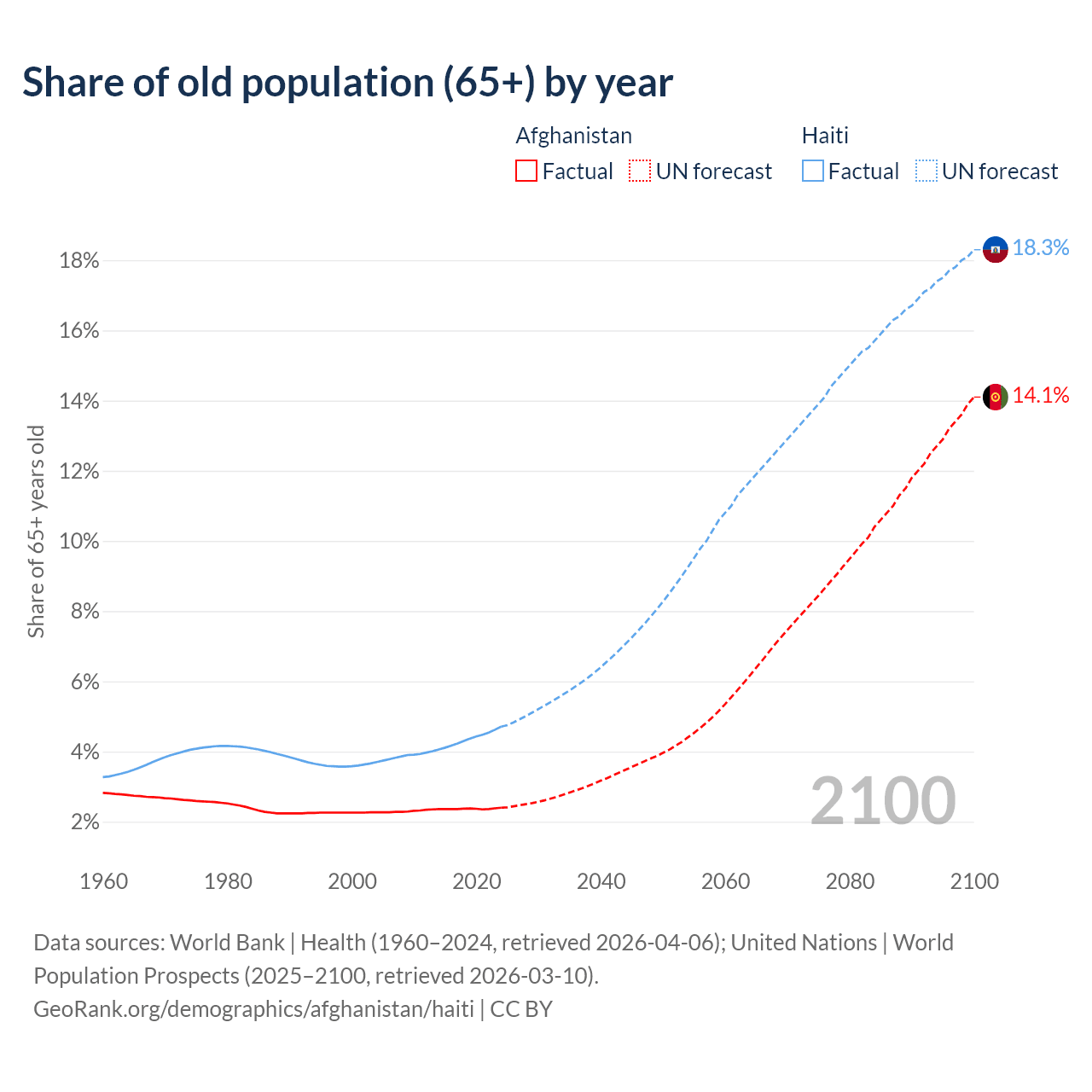 The share of older people aged 65 and over is 2.4% in Afghanistan and 4.71% in Haiti. Life expectancy in Afghanistan compared to Haiti .
