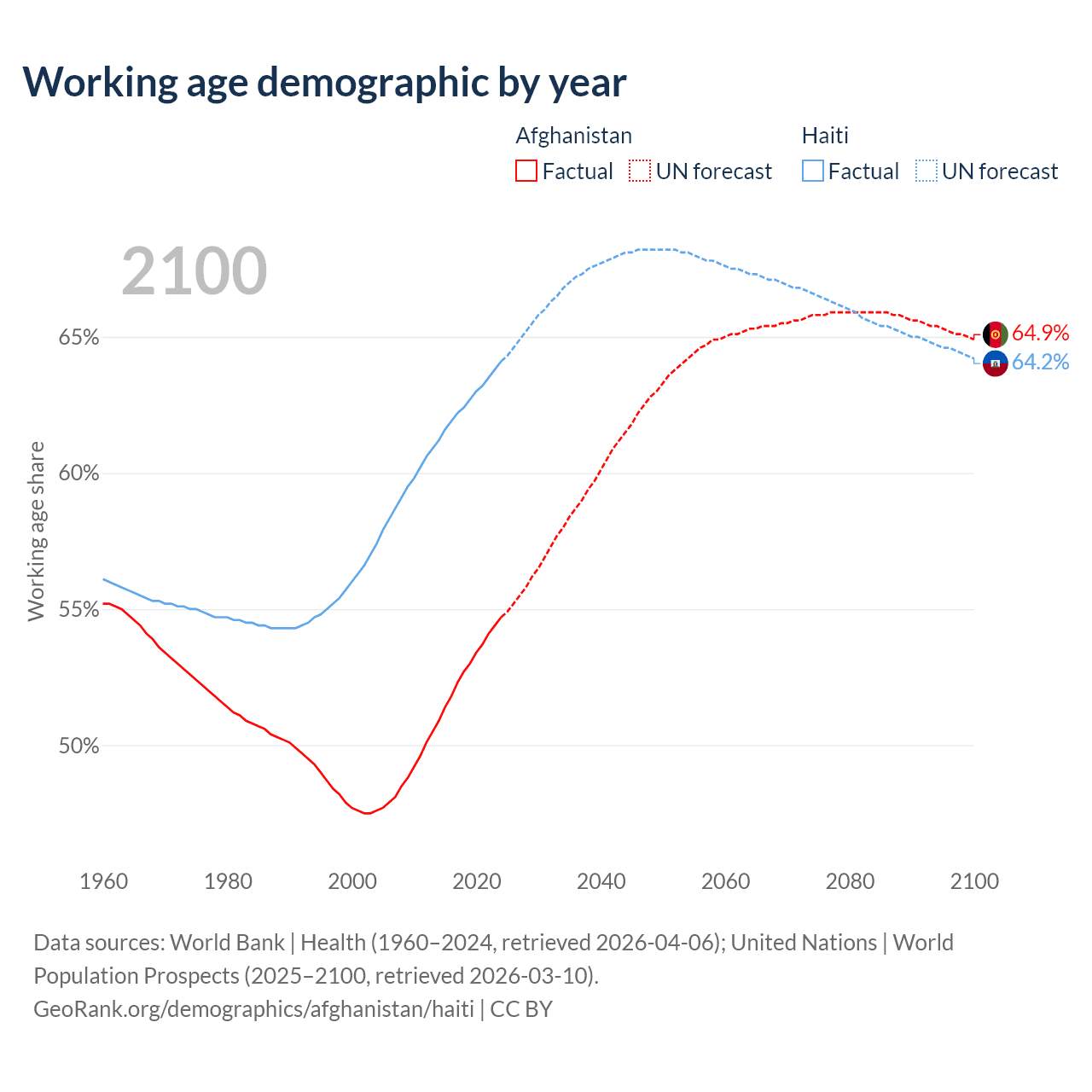 - Afghanistan has 24.8M working age adults (aged 15-64) vs 7.74M in Haiti.