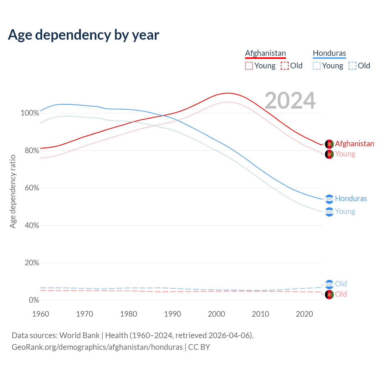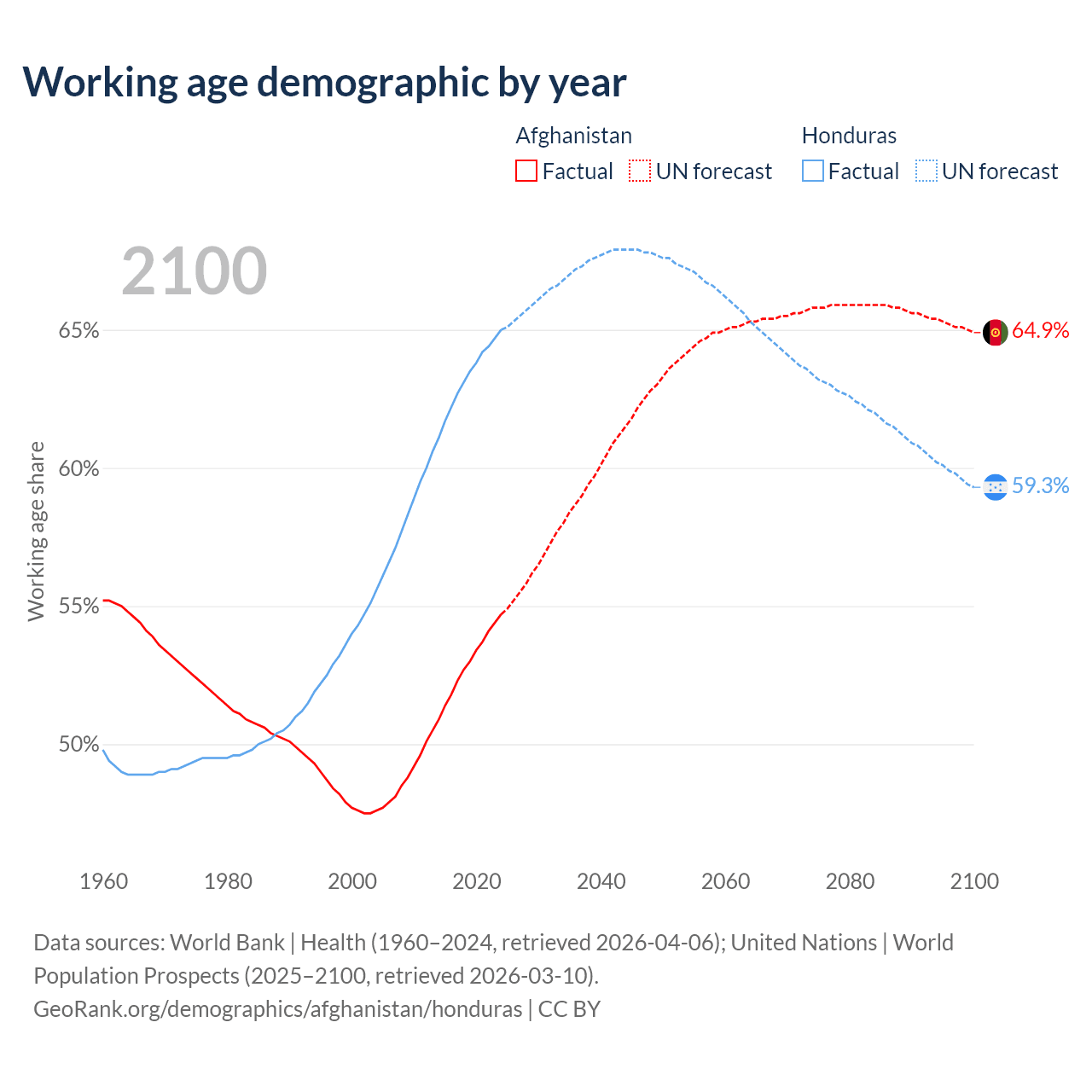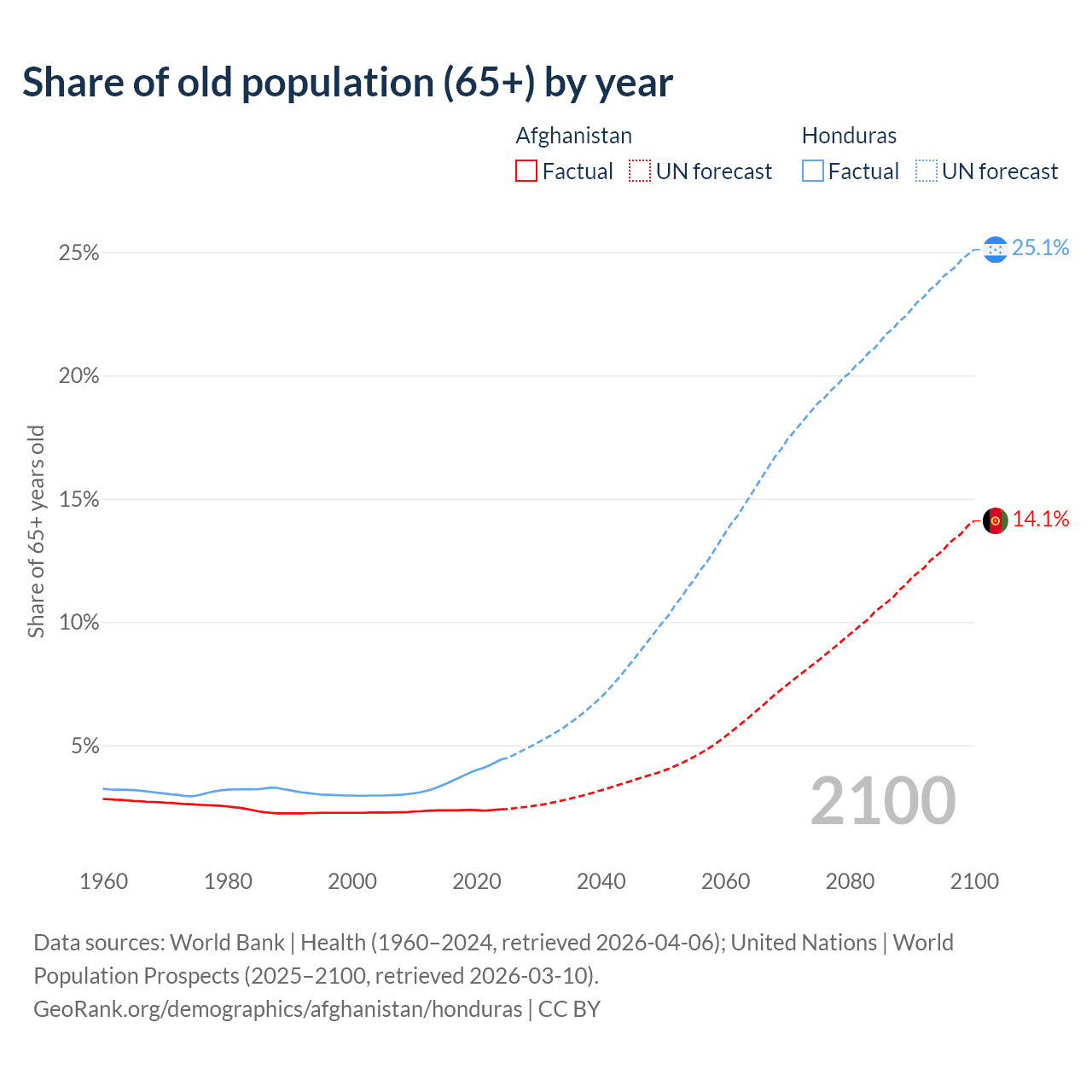 The share of older people aged 65 and over is 2.4% in Afghanistan and 4.42% in Honduras. Life expectancy in Afghanistan compared to Honduras .