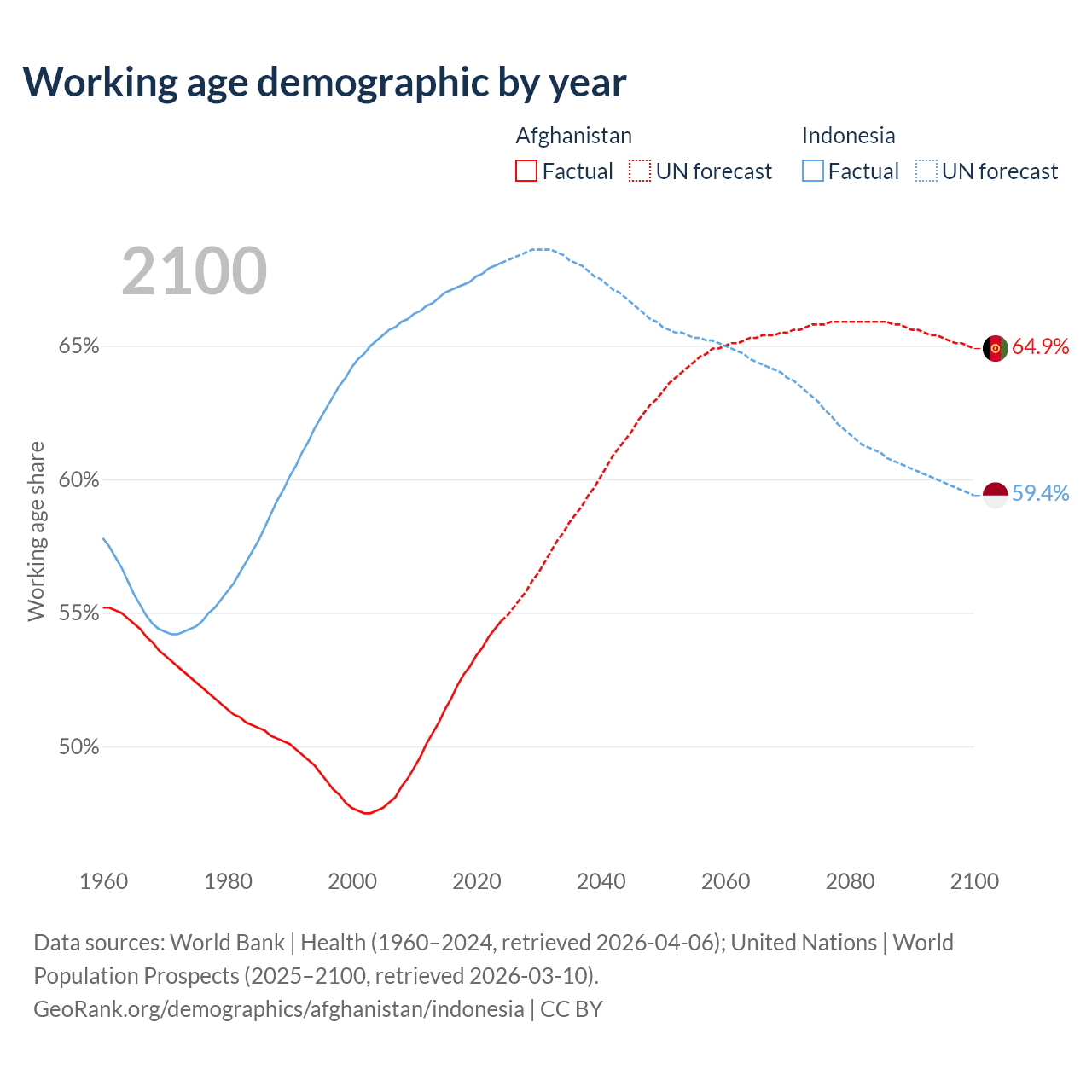Median age Afghanistan vs Indonesia, 1960-2100