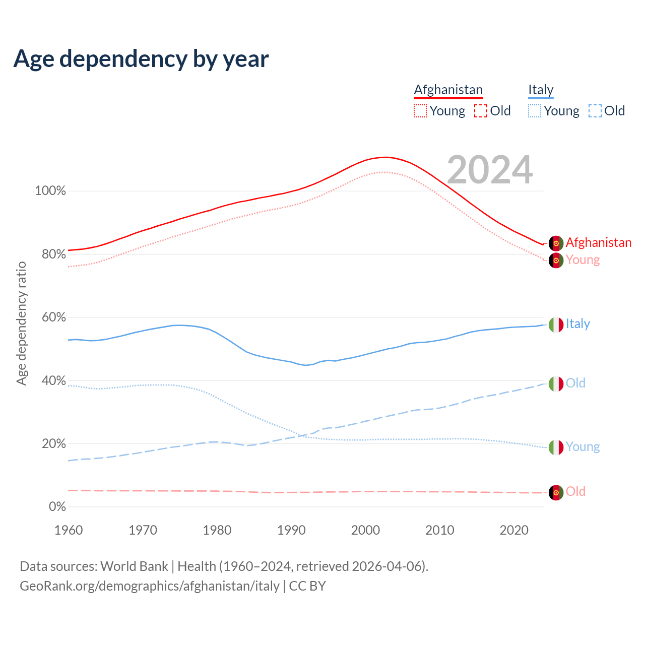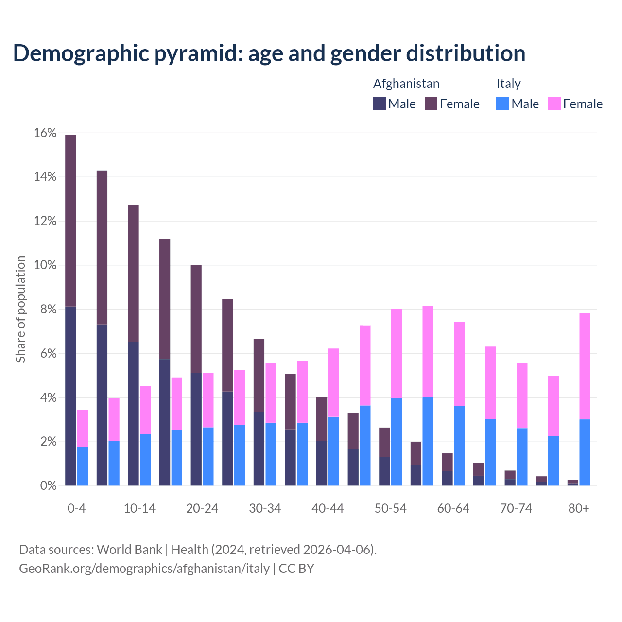 - Afghanistan is ranked 186/196 by median age (oldest to youngest) vs 4/196 for Italy.