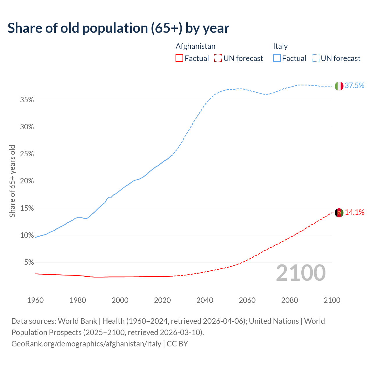 The share of older people aged 65 and over is 2.4% in Afghanistan and 24.6% in Italy. Life expectancy in Afghanistan compared to Italy .