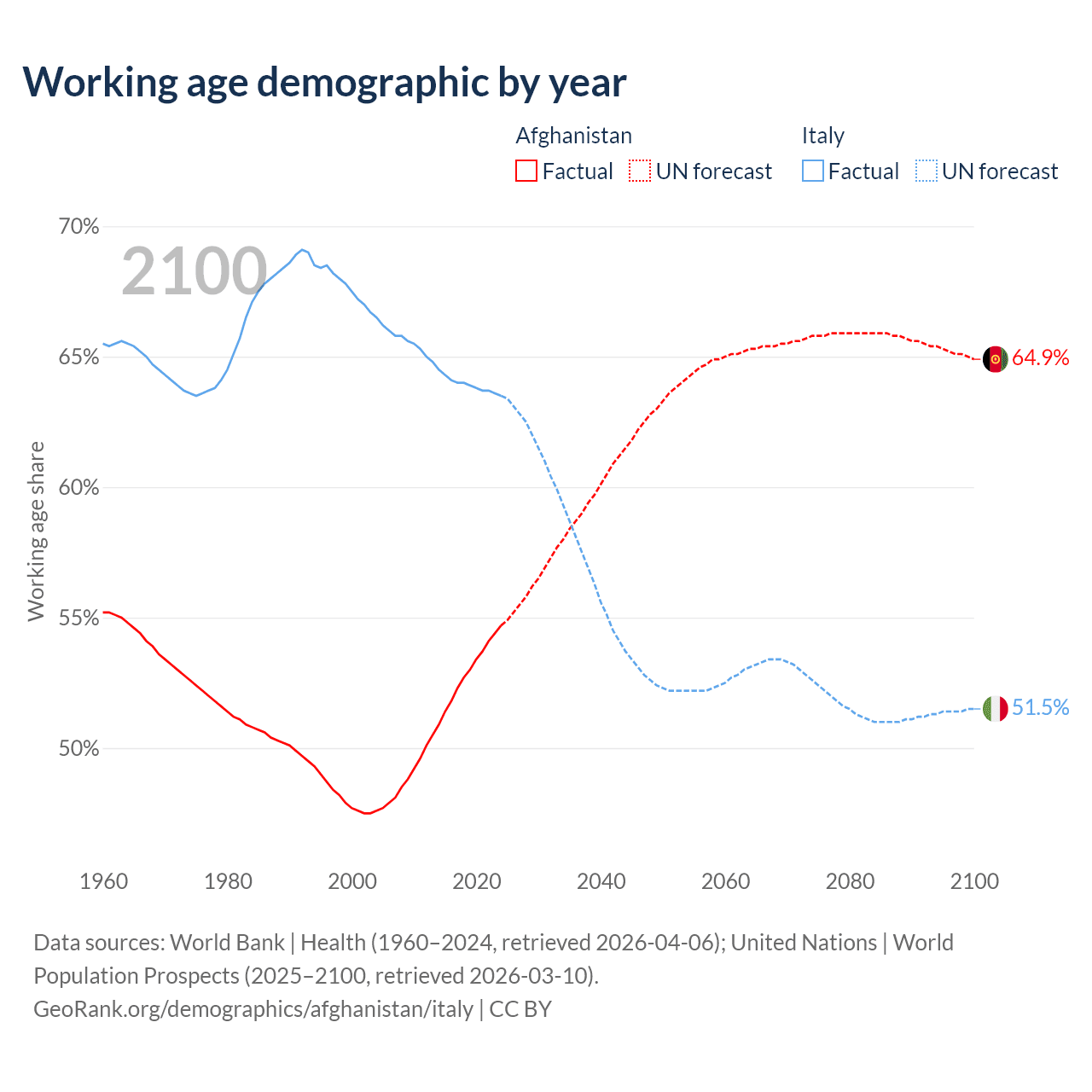 - Afghanistan has 24.8M working age adults (aged 15-64) vs 37.2M in Italy.