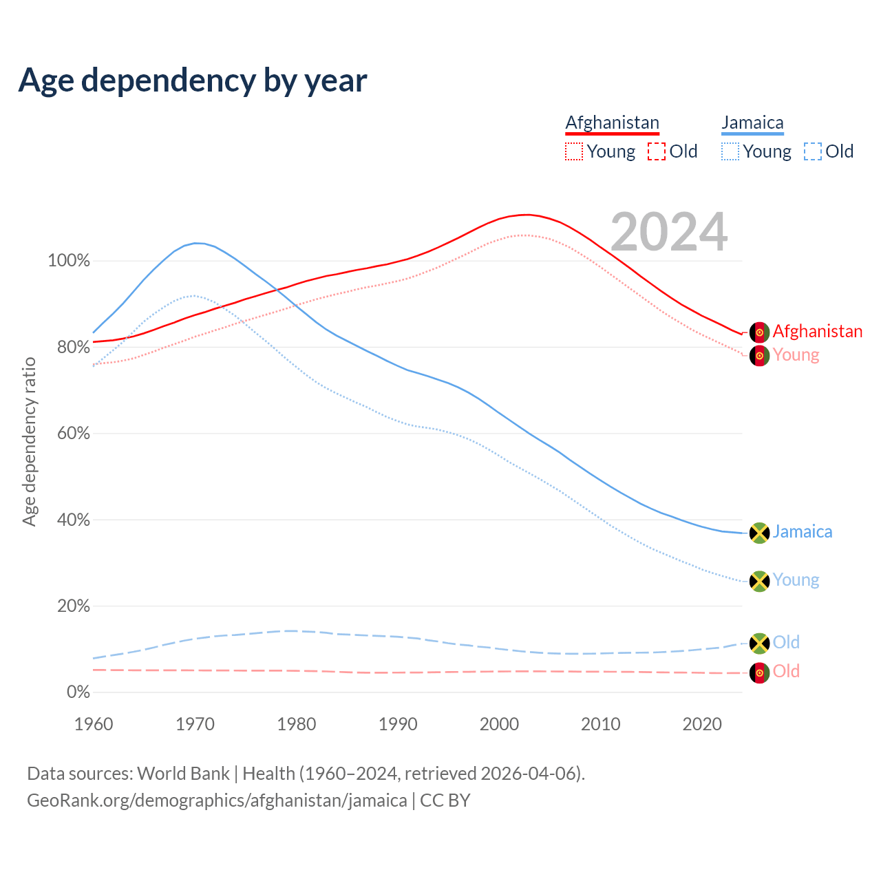 - The share of old-age demographic (65+) in Afghanistan is 2.4% vs 8.21% in Jamaica.