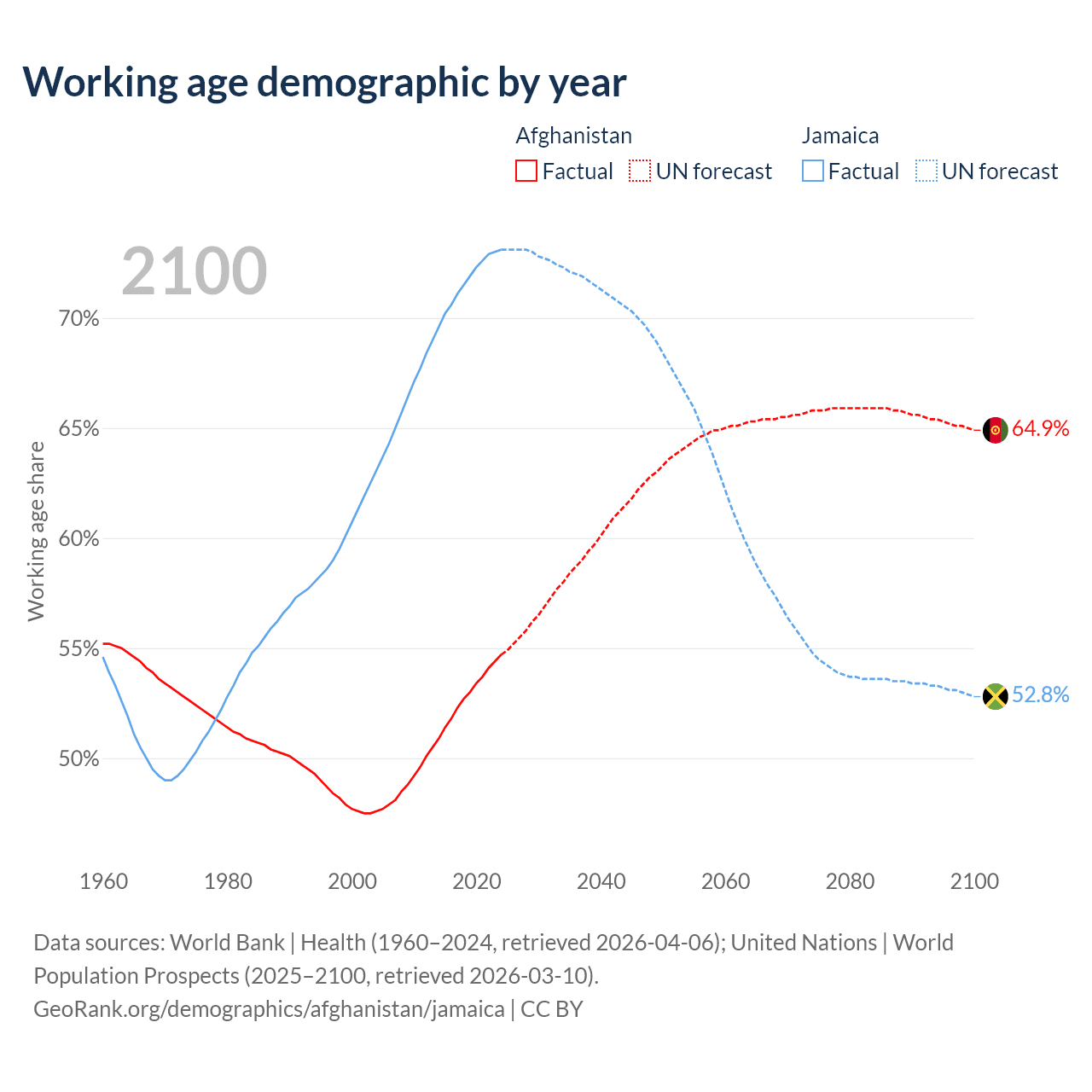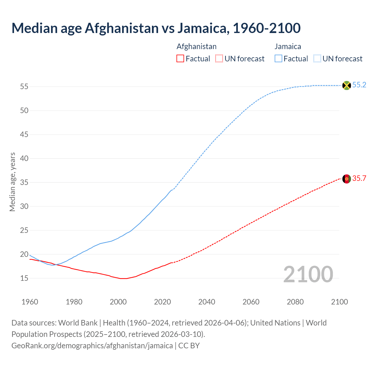 Median age Afghanistan vs Jamaica, 1960-2100