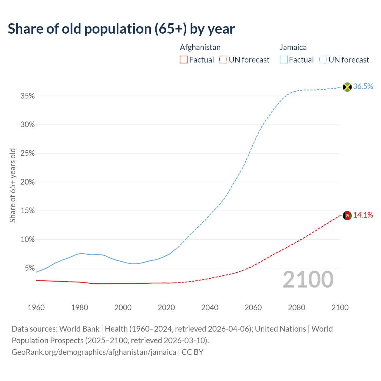 The share of older people aged 65 and over is 2.4% in Afghanistan and 8.21% in Jamaica. Life expectancy in Afghanistan compared to Jamaica .