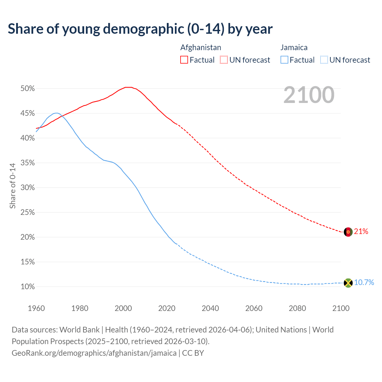 - The share of young demographic (0-15 years old) in Afghanistan is 42.9% vs 18.7% in Jamaica.