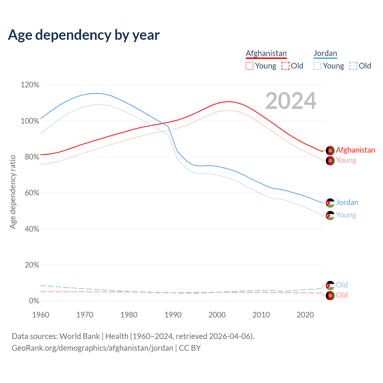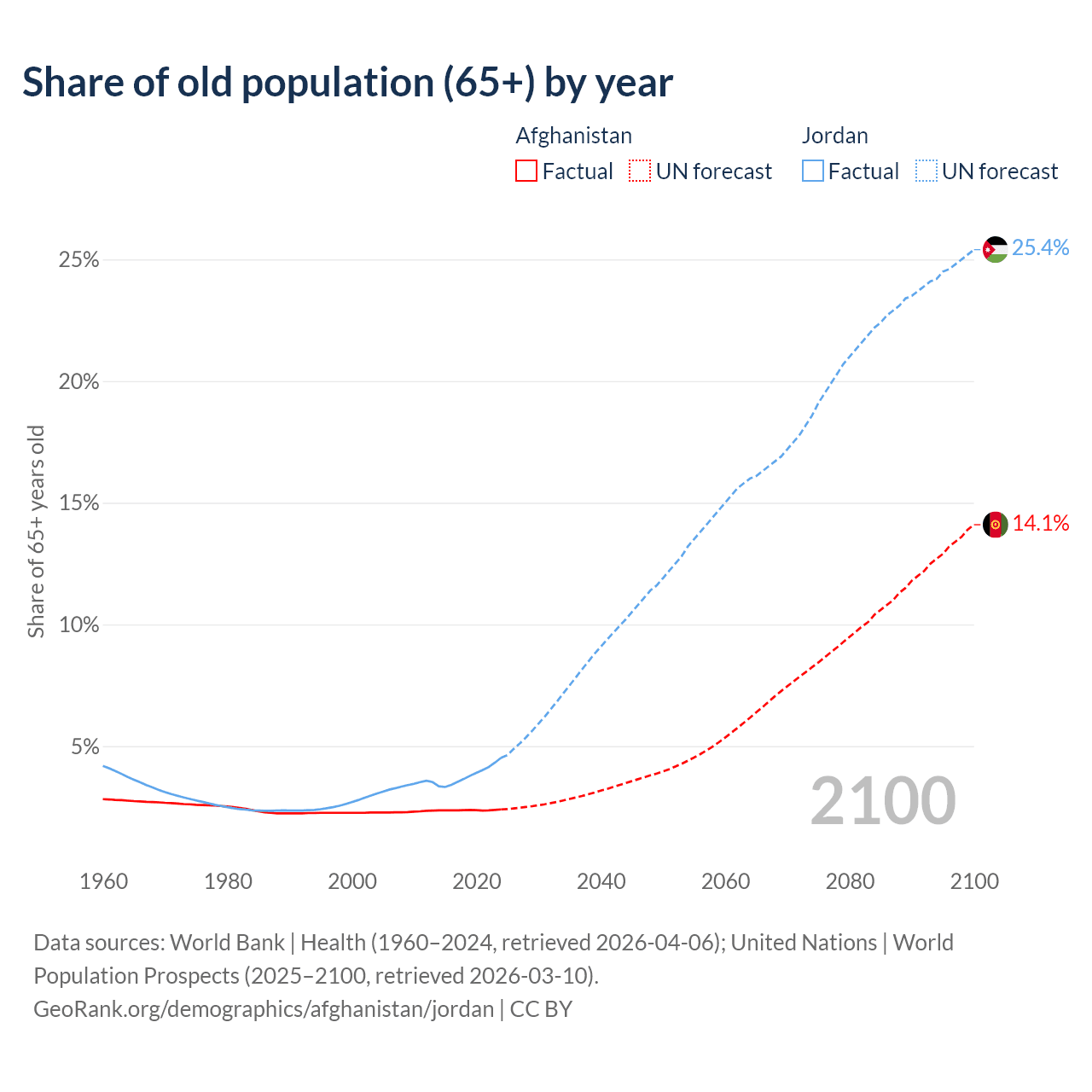 The share of older people aged 65 and over is 2.4% in Afghanistan and 4.52% in Jordan. Life expectancy in Afghanistan compared to Jordan .