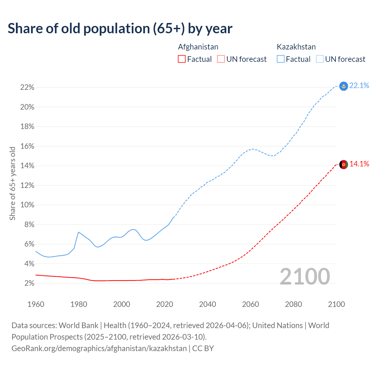 The share of older people aged 65 and over is 2.4% in Afghanistan and 8.65% in Kazakhstan. Life expectancy in Afghanistan compared to Kazakhstan .