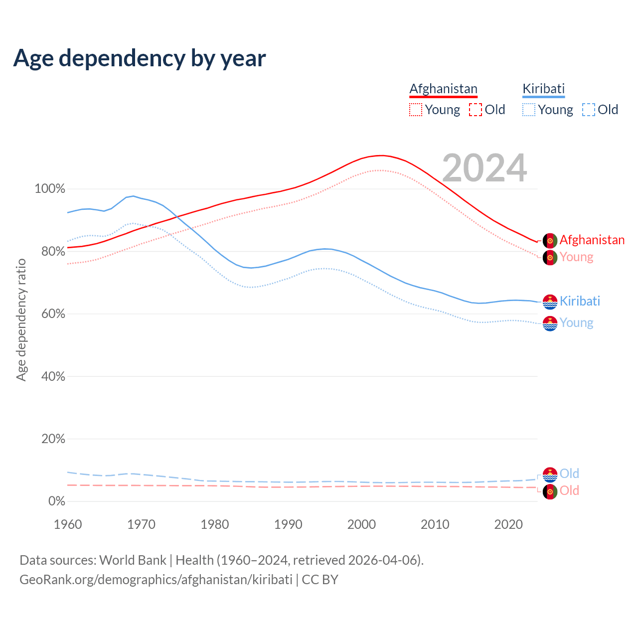 - Afghanistan is ranked 186/196 by median age (oldest to youngest) vs 139/196 for Kiribati.