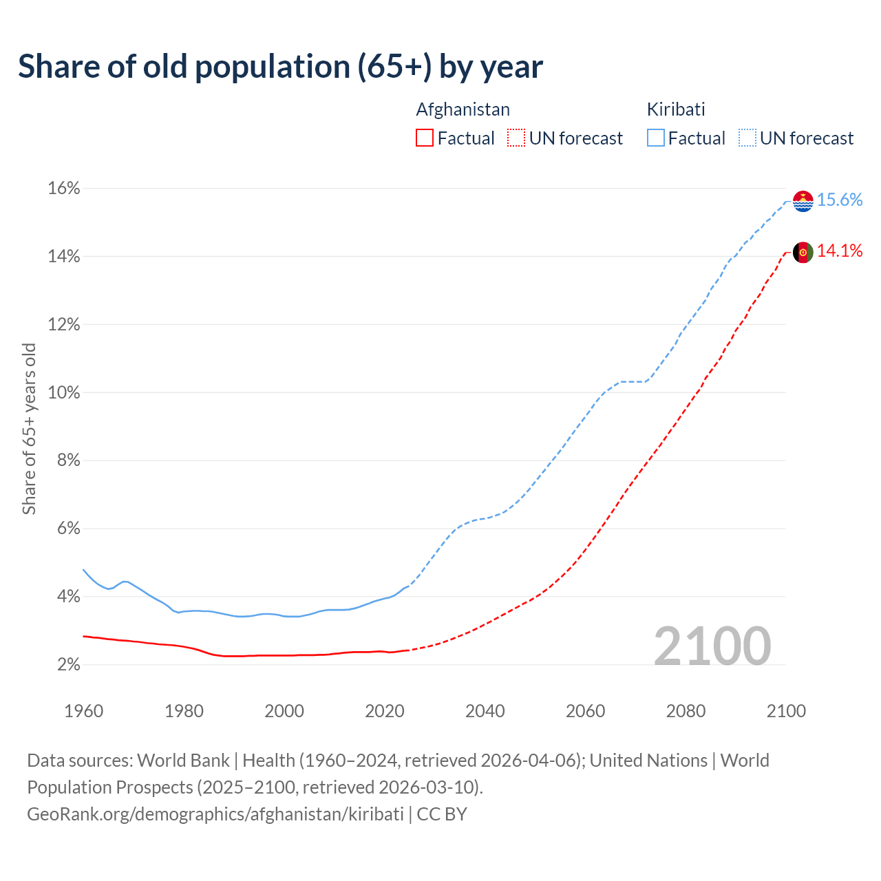 - The share of old-age demographic (65+) in Afghanistan is 2.4% vs 4.24% in Kiribati.