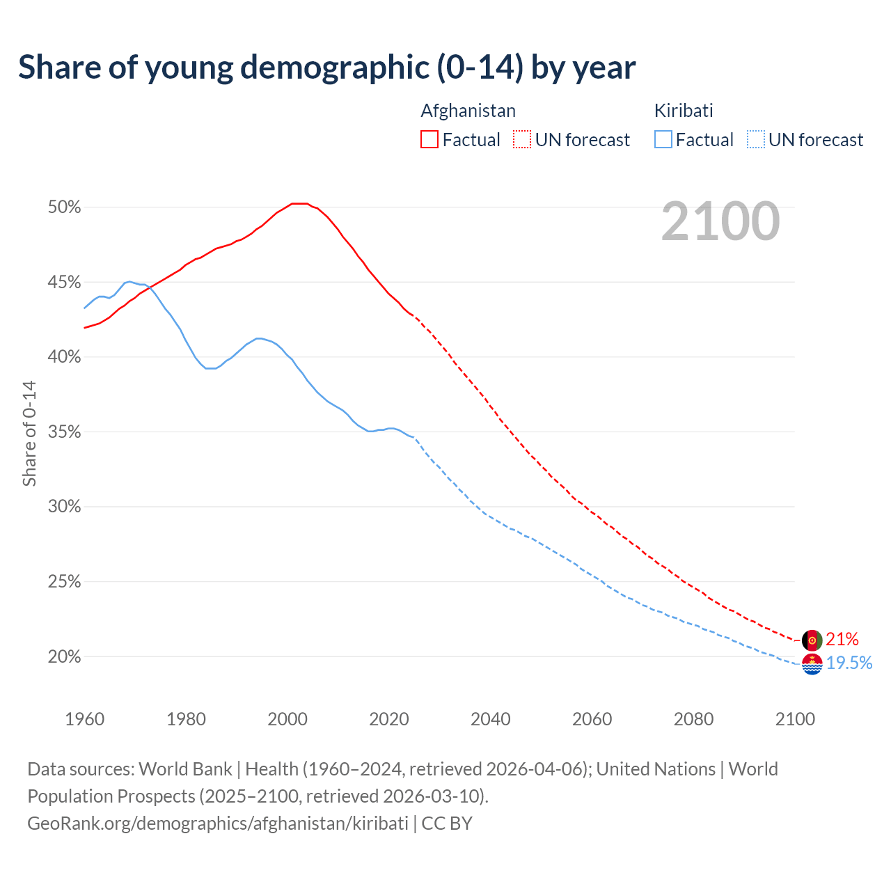 - The share of young demographic (0-15 years old) in Afghanistan is 42.9% vs 34.7% in Kiribati.