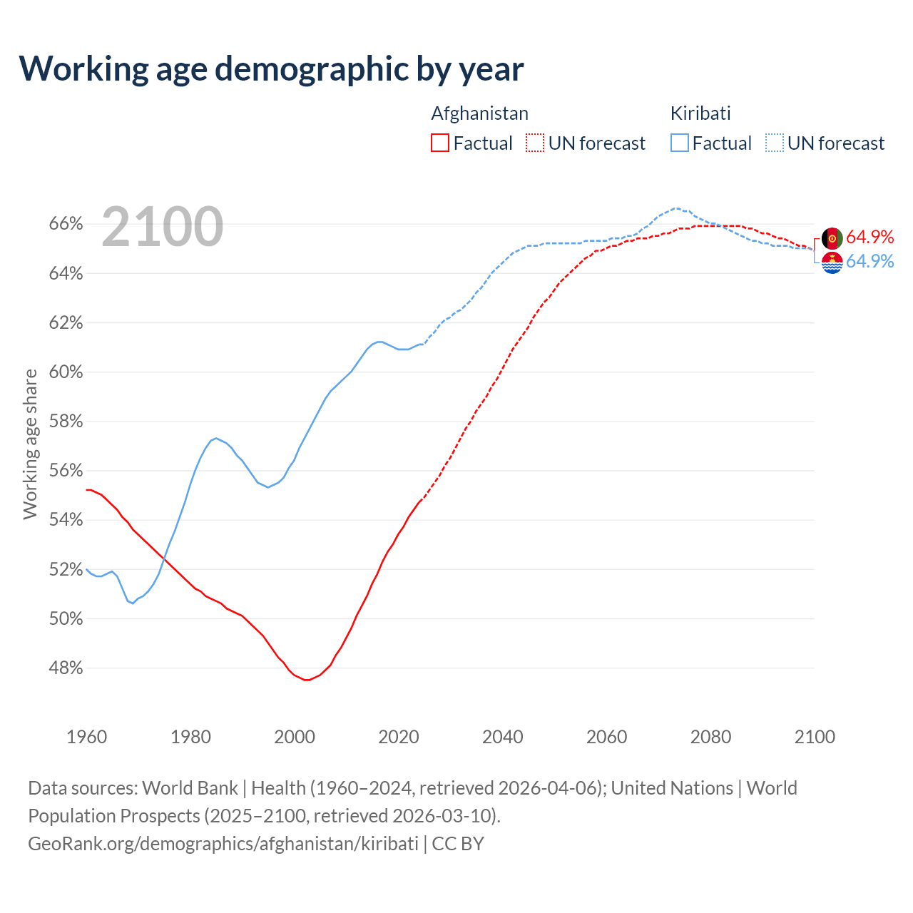 - Afghanistan has 24.8M working age adults (aged 15-64) vs 84.9K in Kiribati.