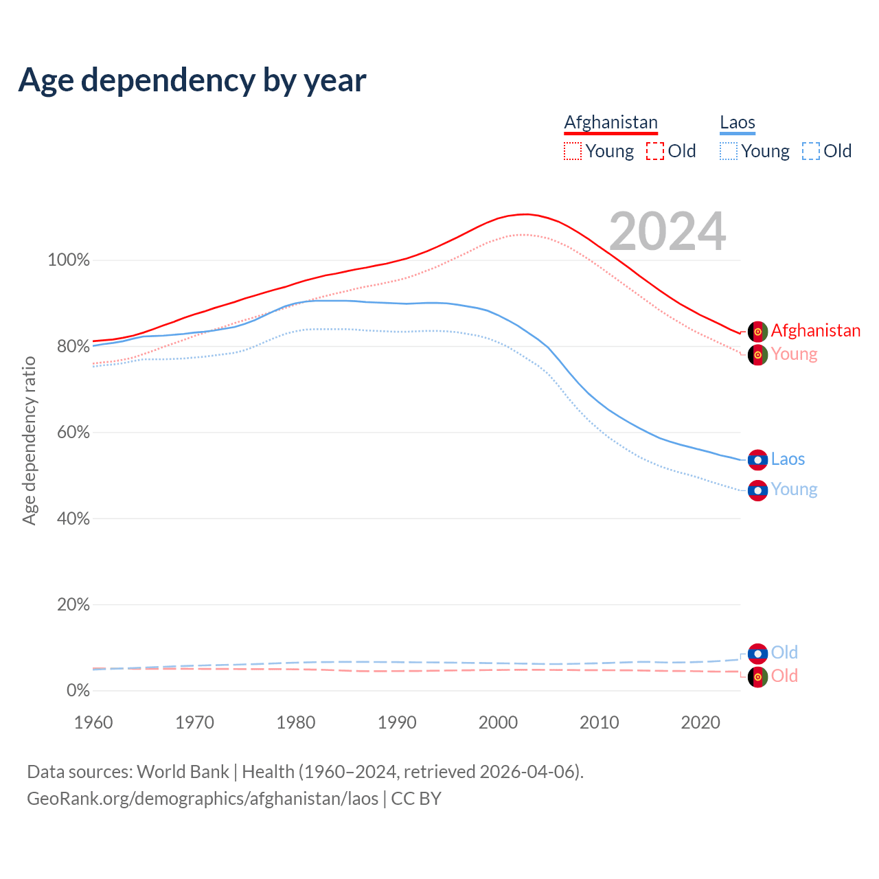 Data sources: World Bank | Health (1960–2024, retrieved 2026-04-06); U.S. Census Bureau (1960–2024, retrieved 2026-02-08).