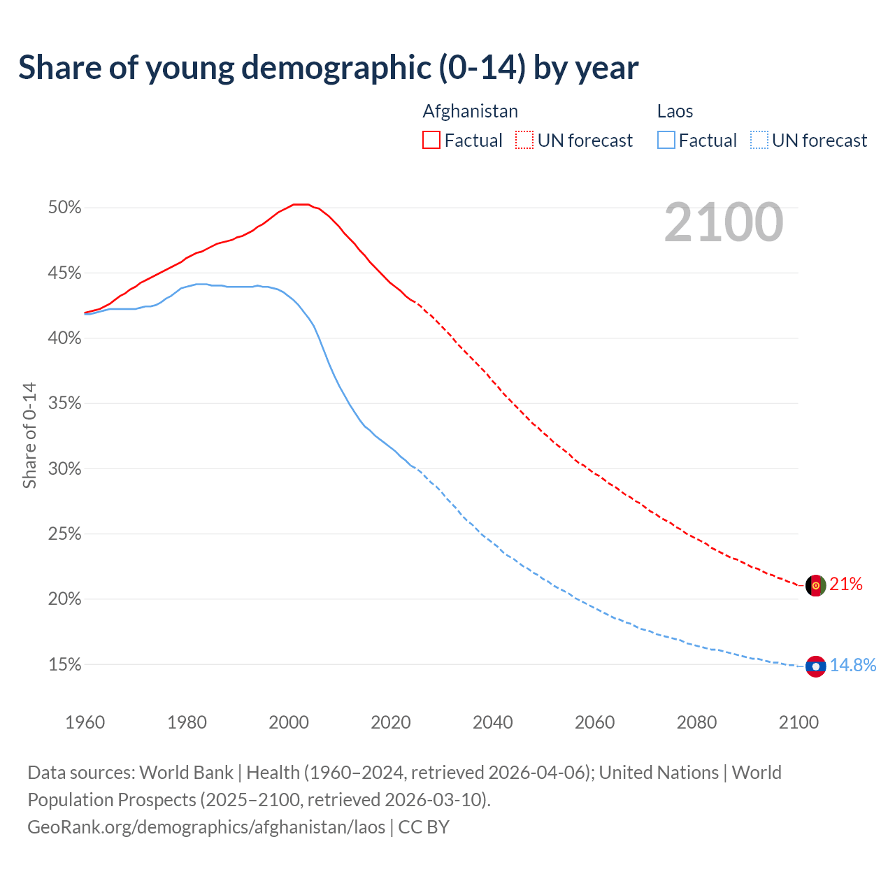 - The share of young demographic (0-15 years old) in Afghanistan is 42.9% vs 30.2% in Laos.