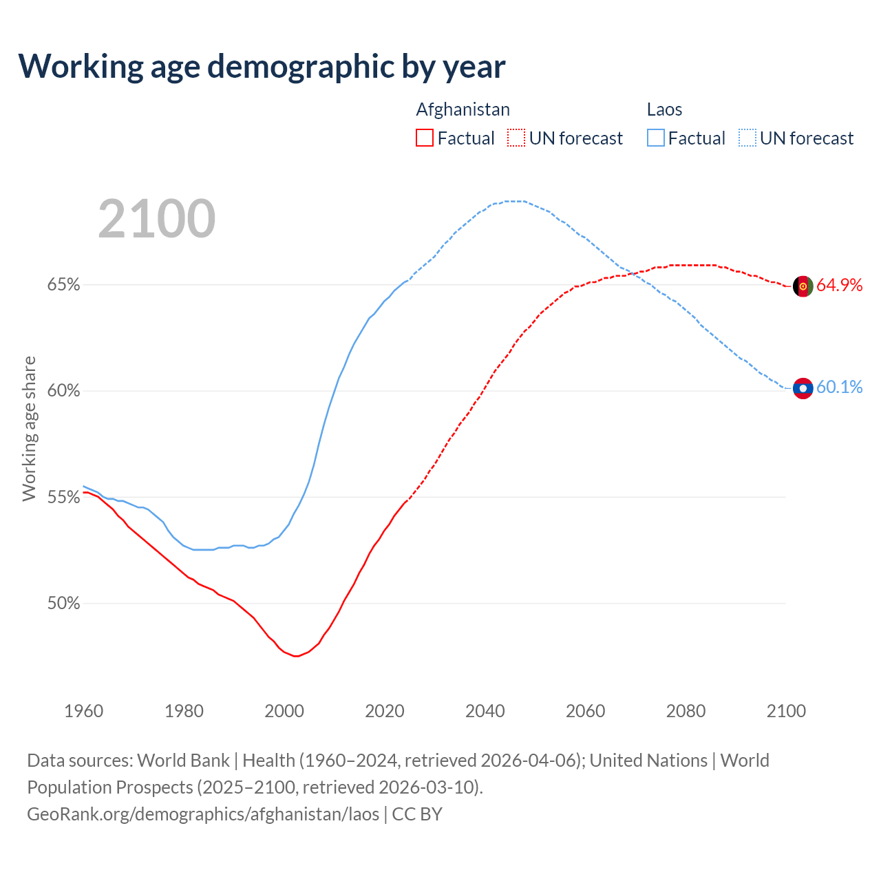 Median age Afghanistan vs Laos, 1960-2100