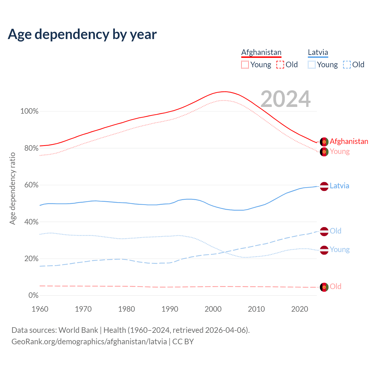 - The share of old-age demographic (65+) in Afghanistan is 2.4% vs 21.7% in Latvia.