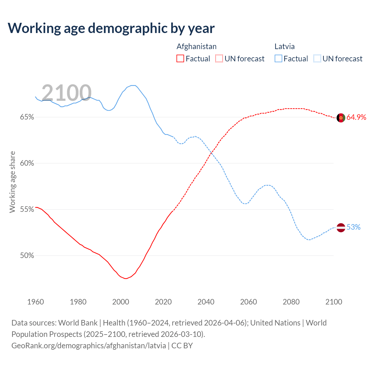 - Afghanistan has 24.8M working age adults (aged 15-64) vs 1.15M in Latvia.