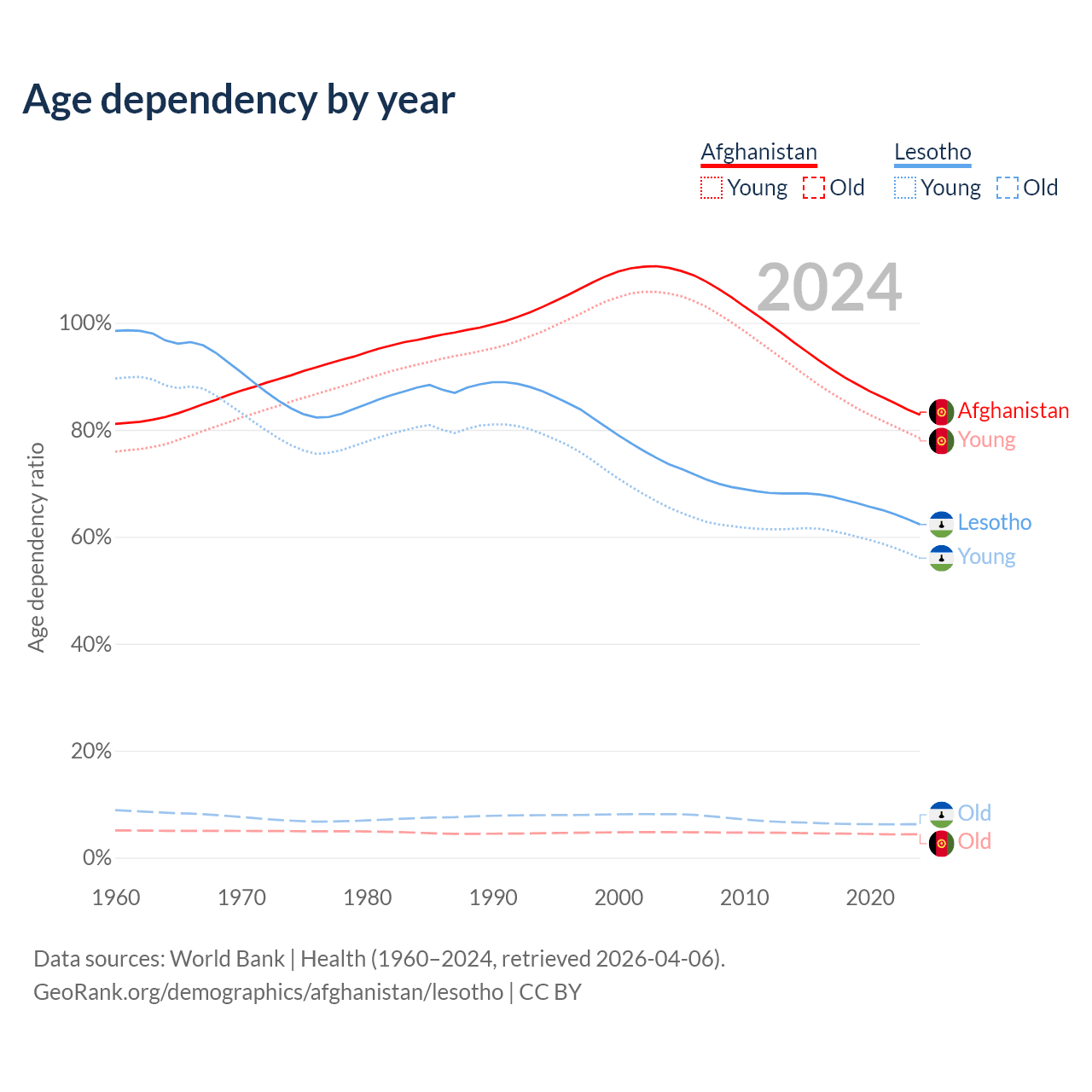 - Afghanistan is ranked 186/196 by median age (oldest to youngest) vs 143/196 for Lesotho.