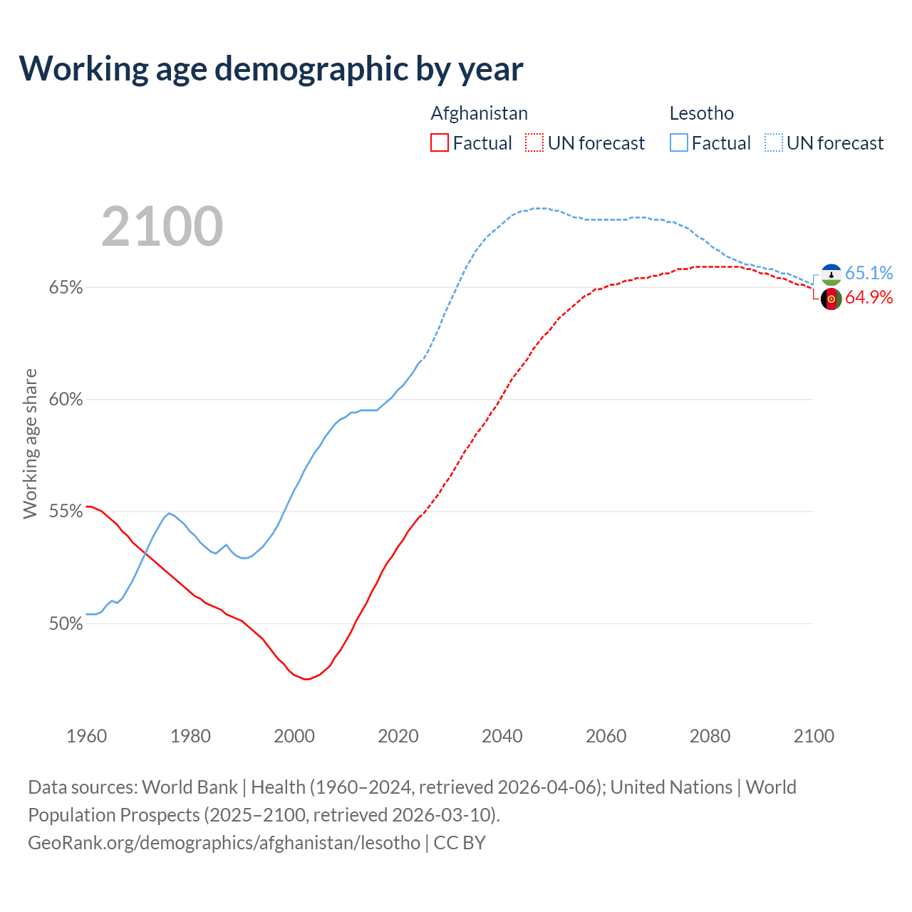 - Afghanistan has 24.8M working age adults (aged 15-64) vs 1.48M in Lesotho.