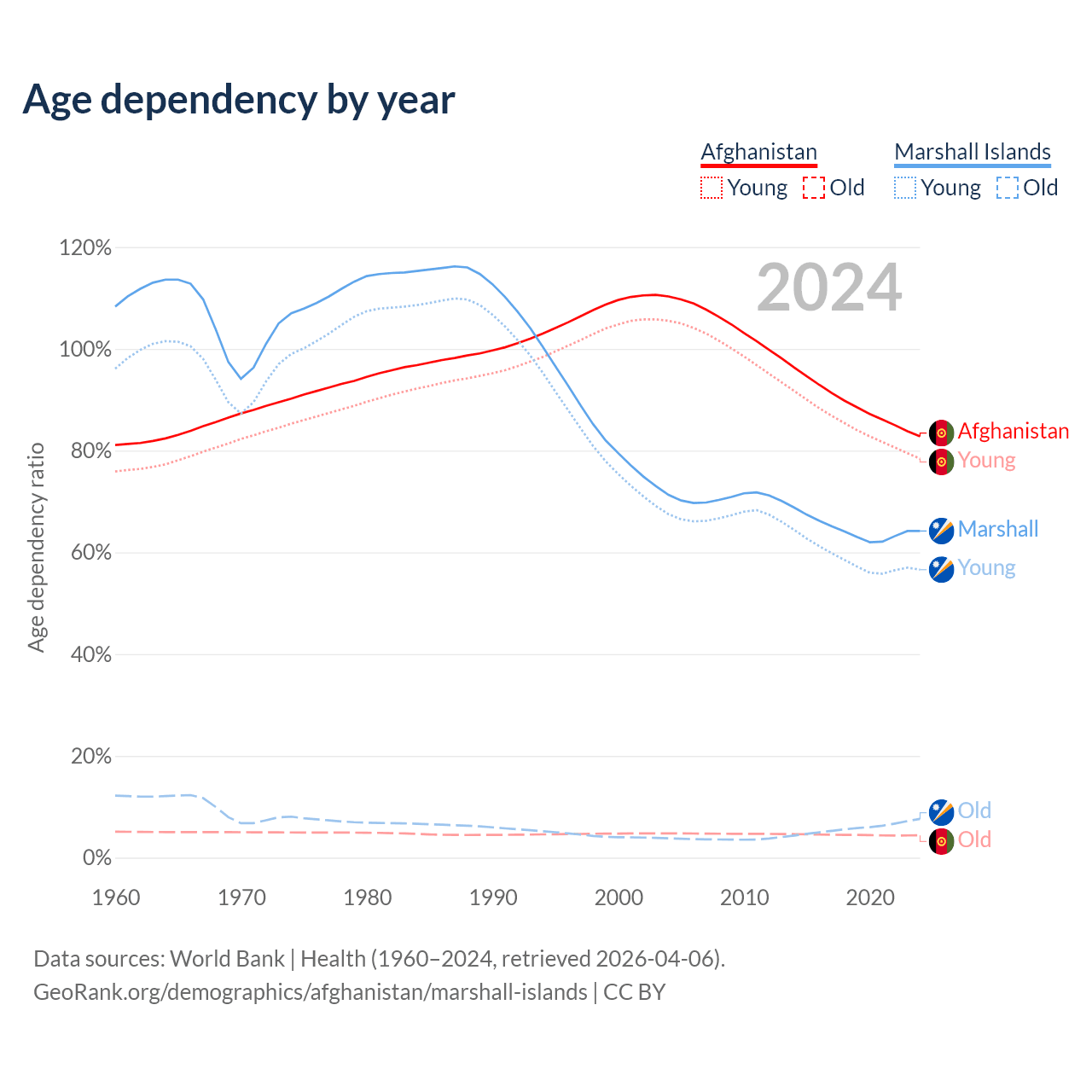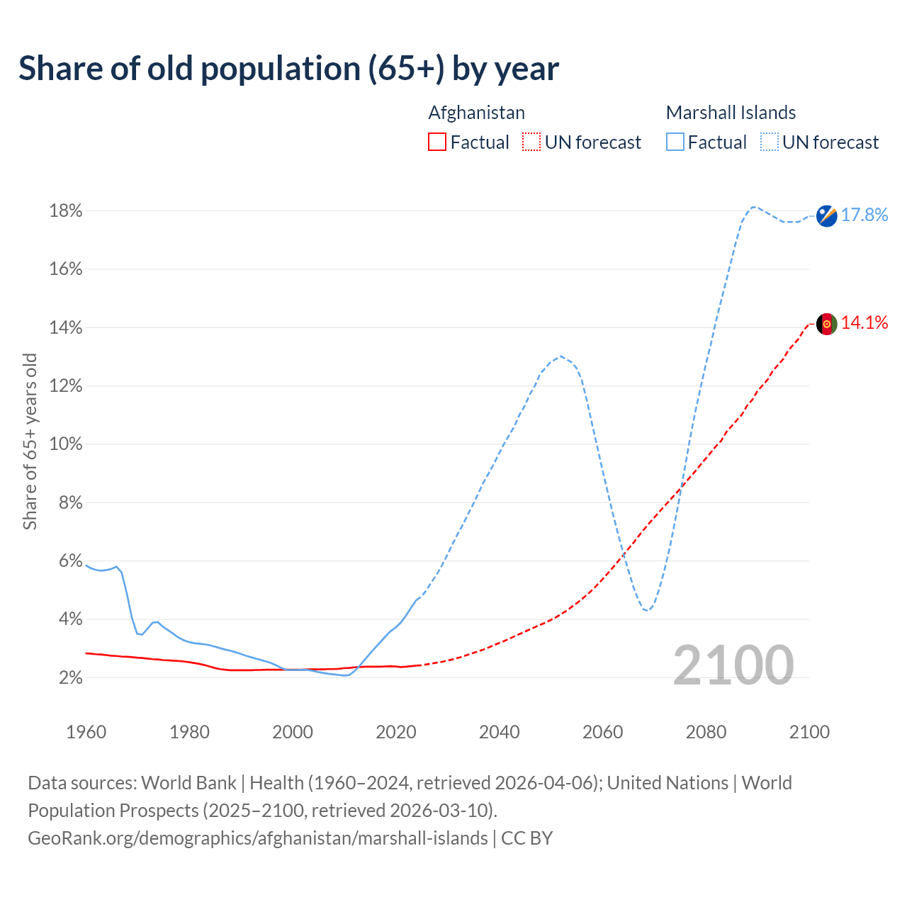 - The share of old-age demographic (65+) in Afghanistan is 2.4% vs 4.64% in the Marshall Islands.