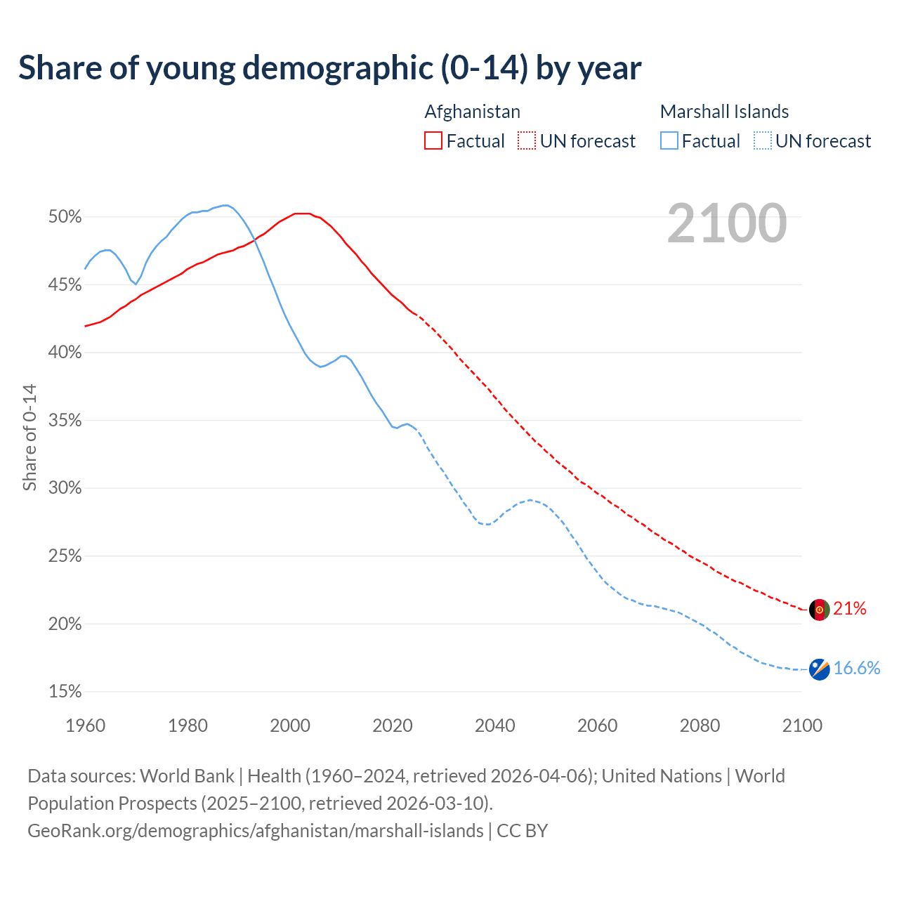 - The share of young demographic (0-15 years old) in Afghanistan is 42.9% vs 34.5% in the Marshall Islands.