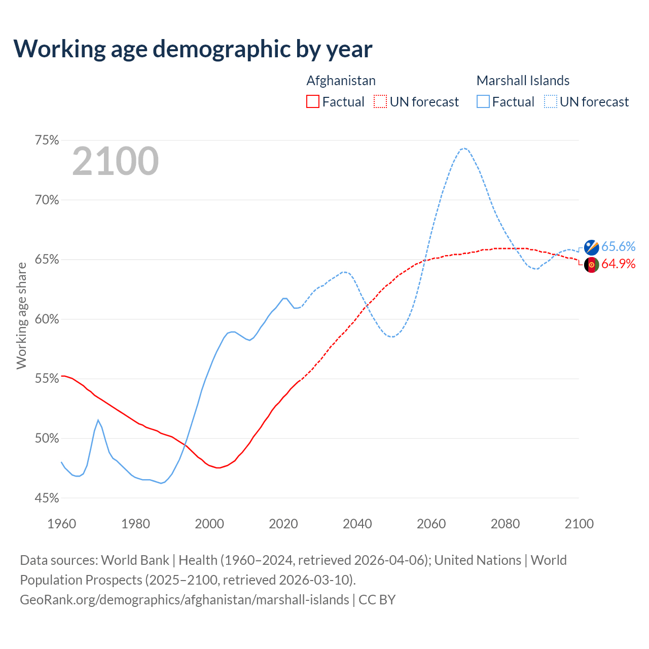 Median age Afghanistan vs Marshall Islands, 1960-2100