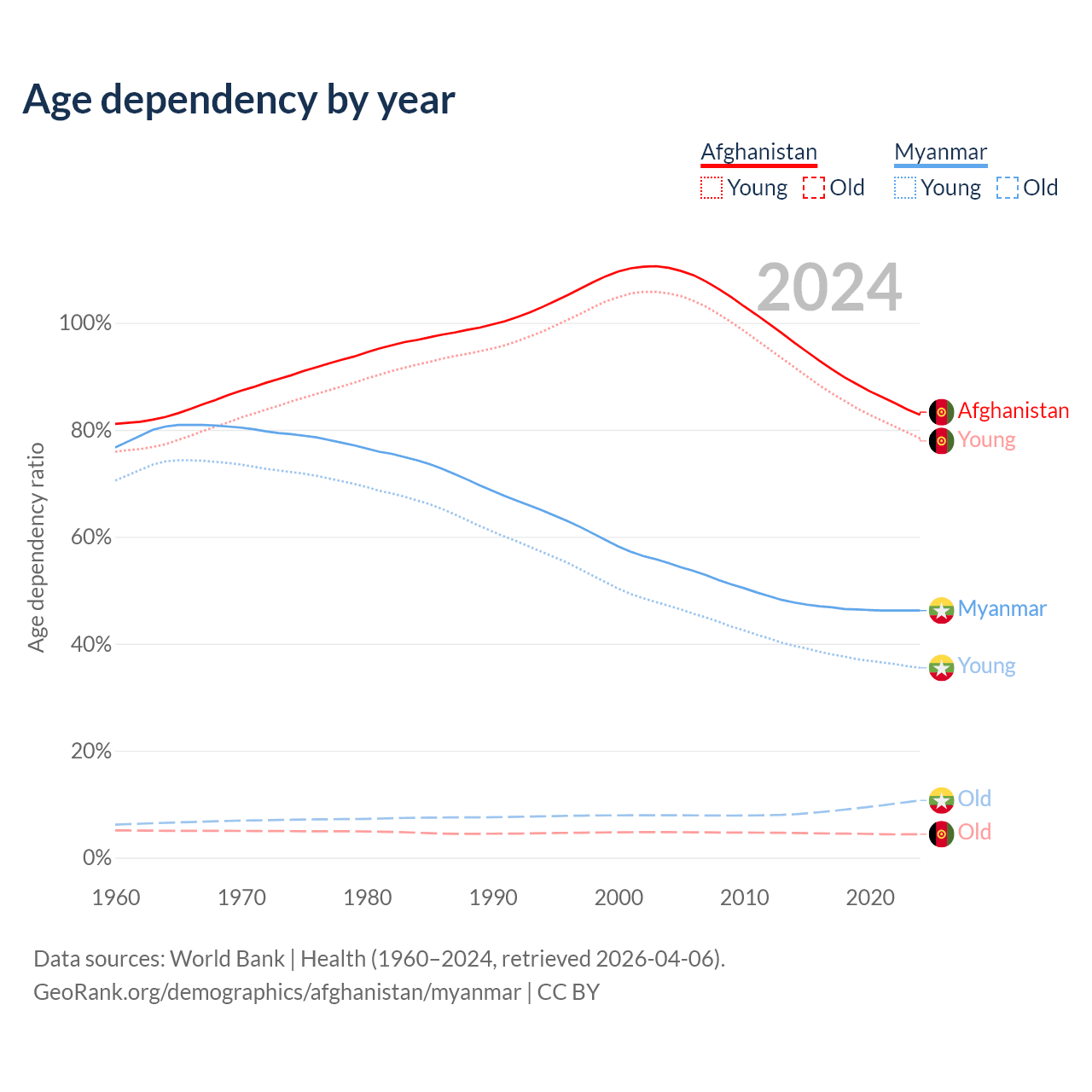 - Afghanistan is ranked 186/196 by median age (oldest to youngest) vs 96/196 for Myanmar.