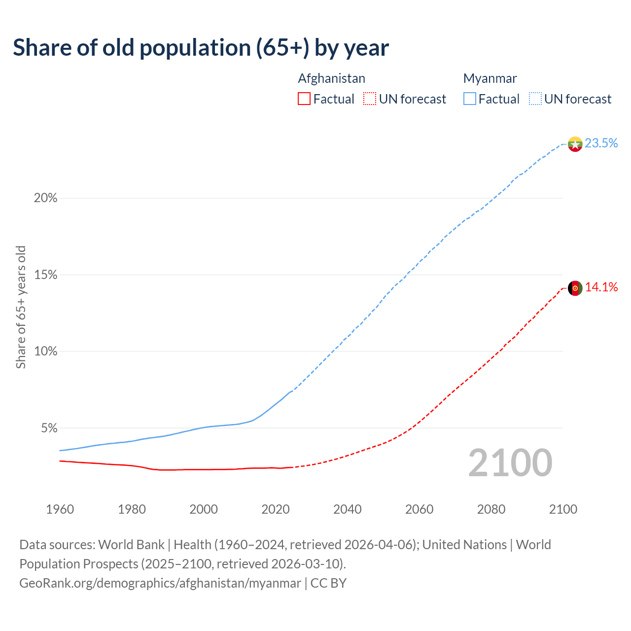 The share of older people aged 65 and over is 2.4% in Afghanistan and 7.3% in Myanmar. Life expectancy in Afghanistan compared to Myanmar .