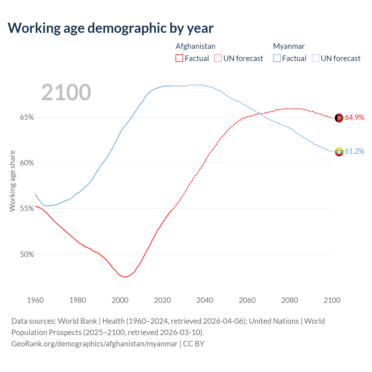 - Afghanistan has 24.8M working age adults (aged 15-64) vs 37.8M in Myanmar.