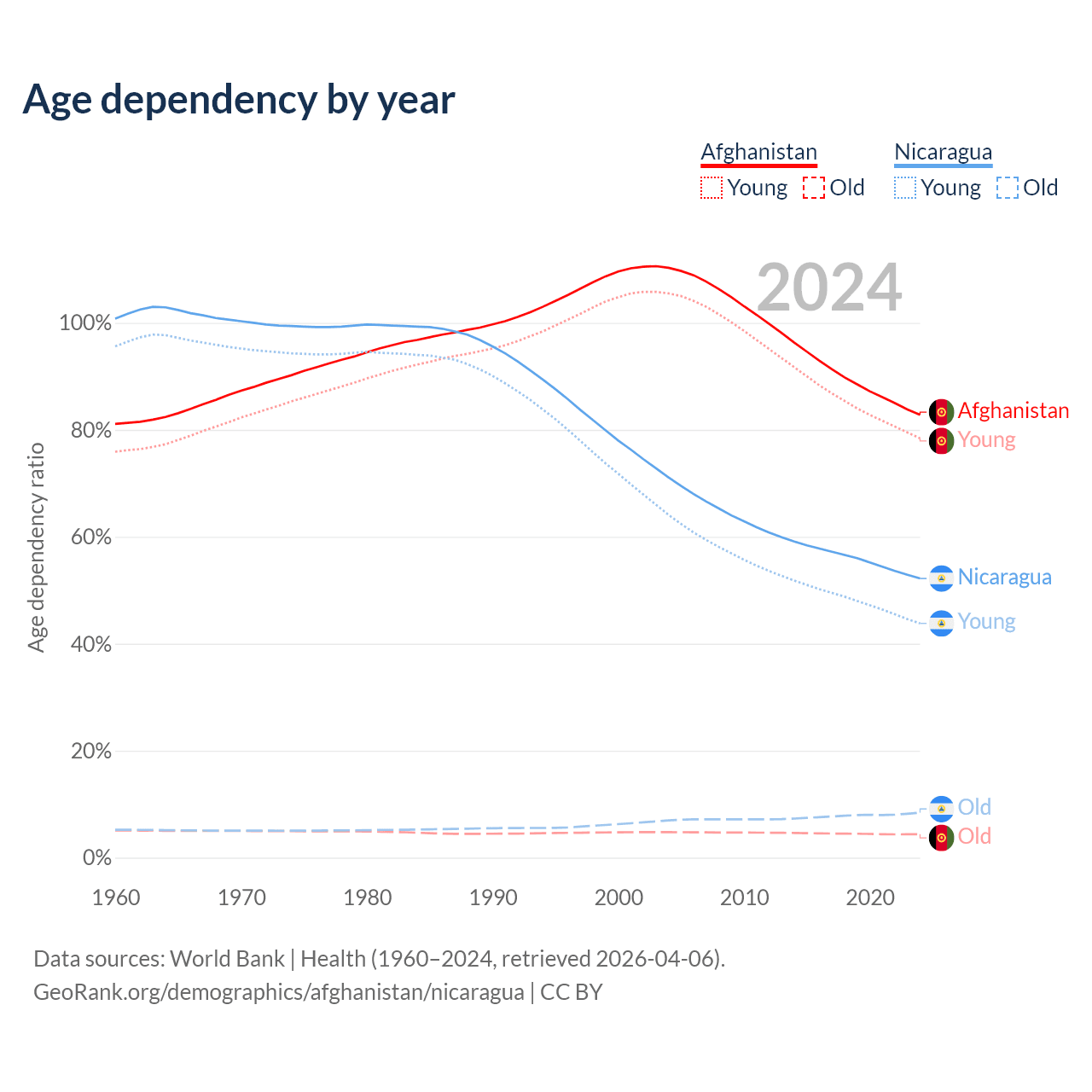 - The share of old-age demographic (65+) in Afghanistan is 2.4% vs 5.53% in Nicaragua.