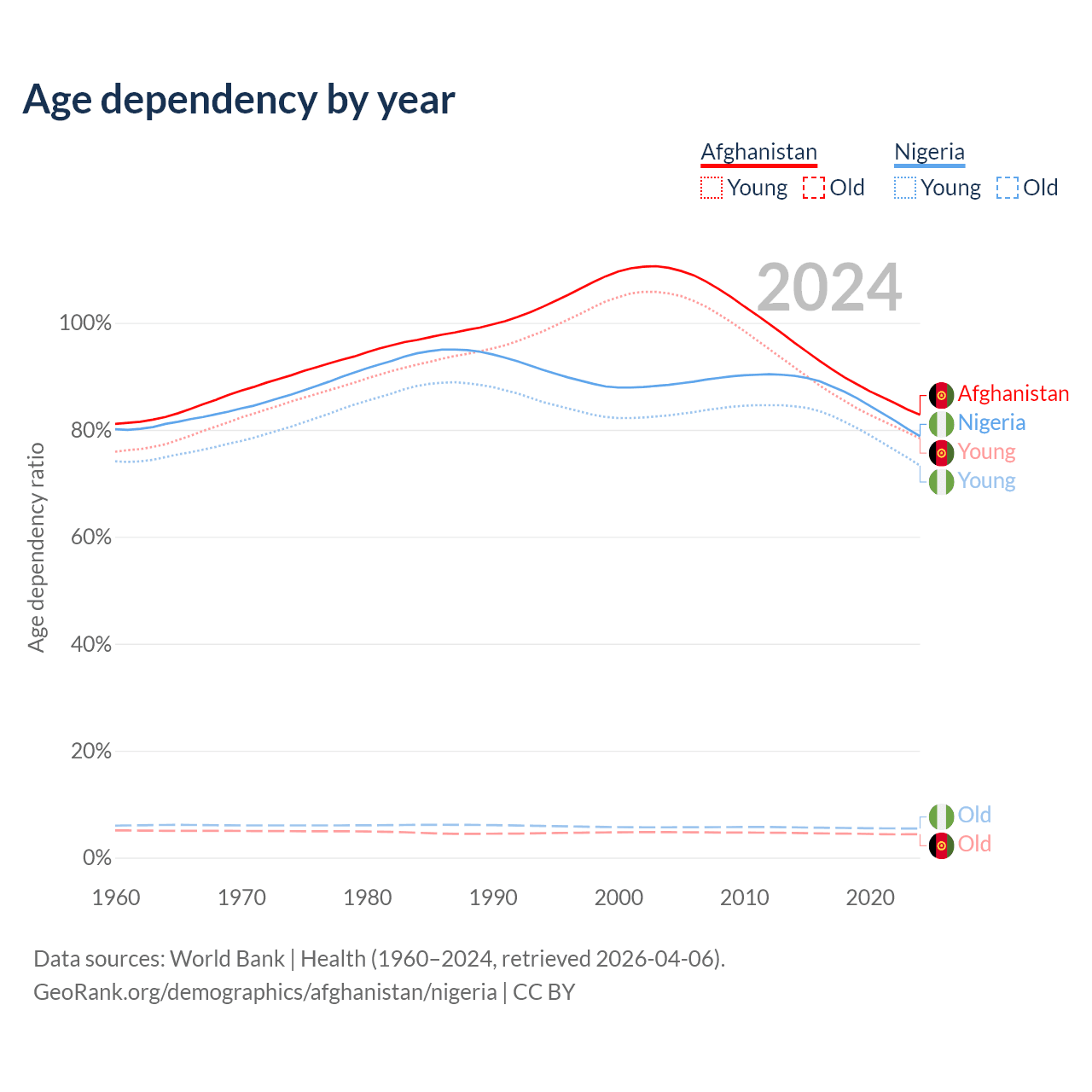 - Afghanistan is ranked 186/196 by median age (oldest to youngest) vs 178/196 for Nigeria.