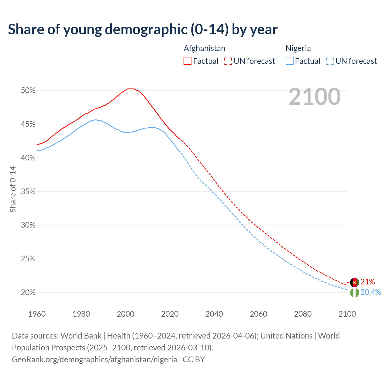 - The share of young demographic (0-15 years old) in Afghanistan is 42.9% vs 41% in Nigeria.