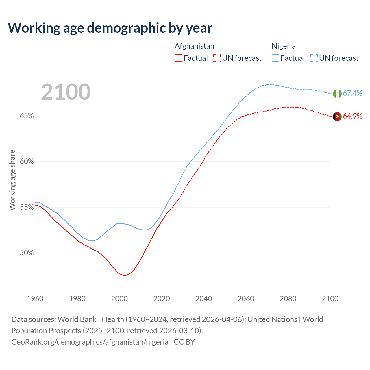 - Afghanistan has 24.8M working age adults (aged 15-64) vs 136M in Nigeria.