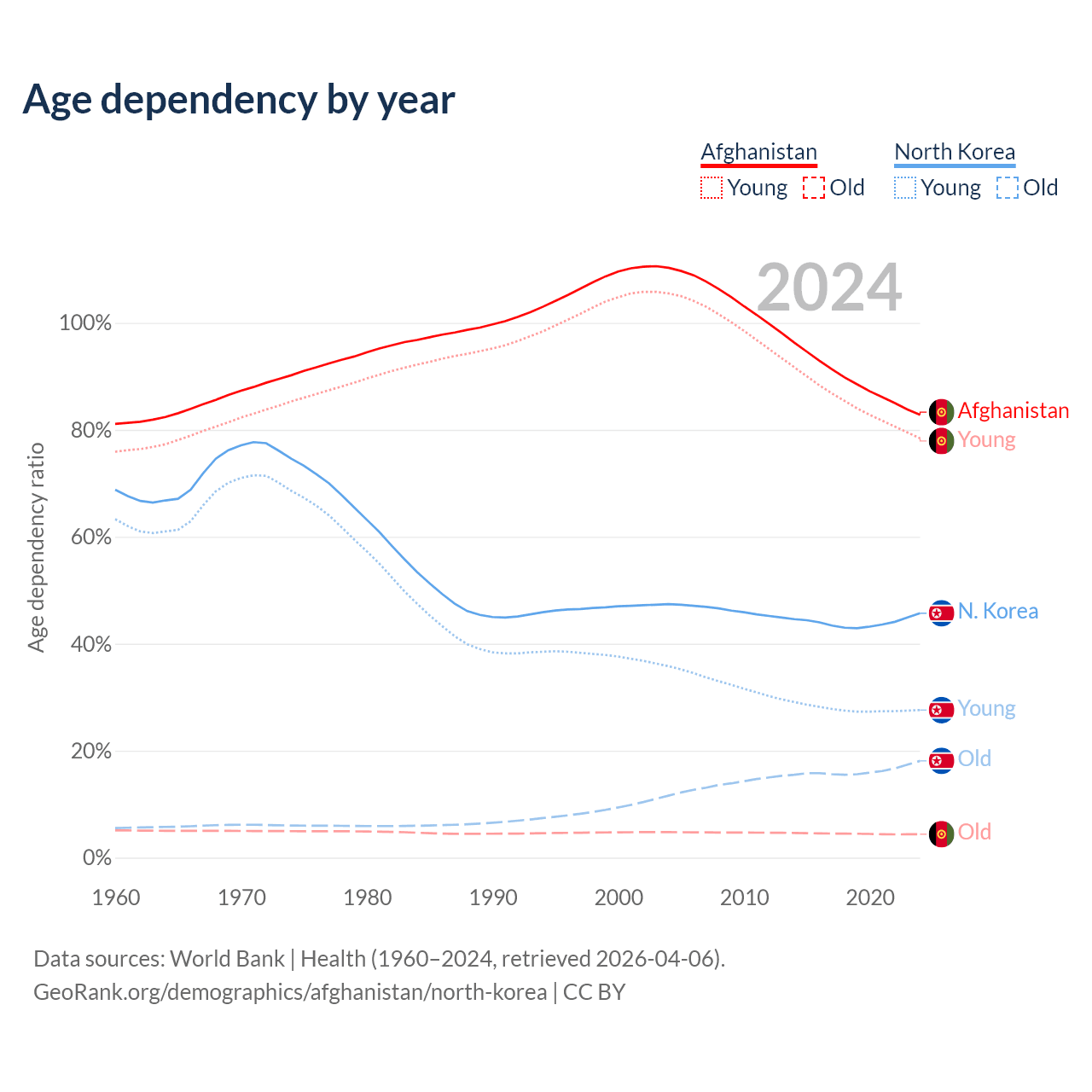 - The share of old-age demographic (65+) in Afghanistan is 2.4% vs 12.4% in North Korea.