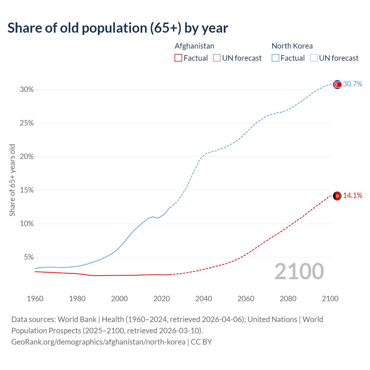 The share of older people aged 65 and over is 2.4% in Afghanistan and 12.4% in North Korea. Life expectancy in Afghanistan compared to North Korea .