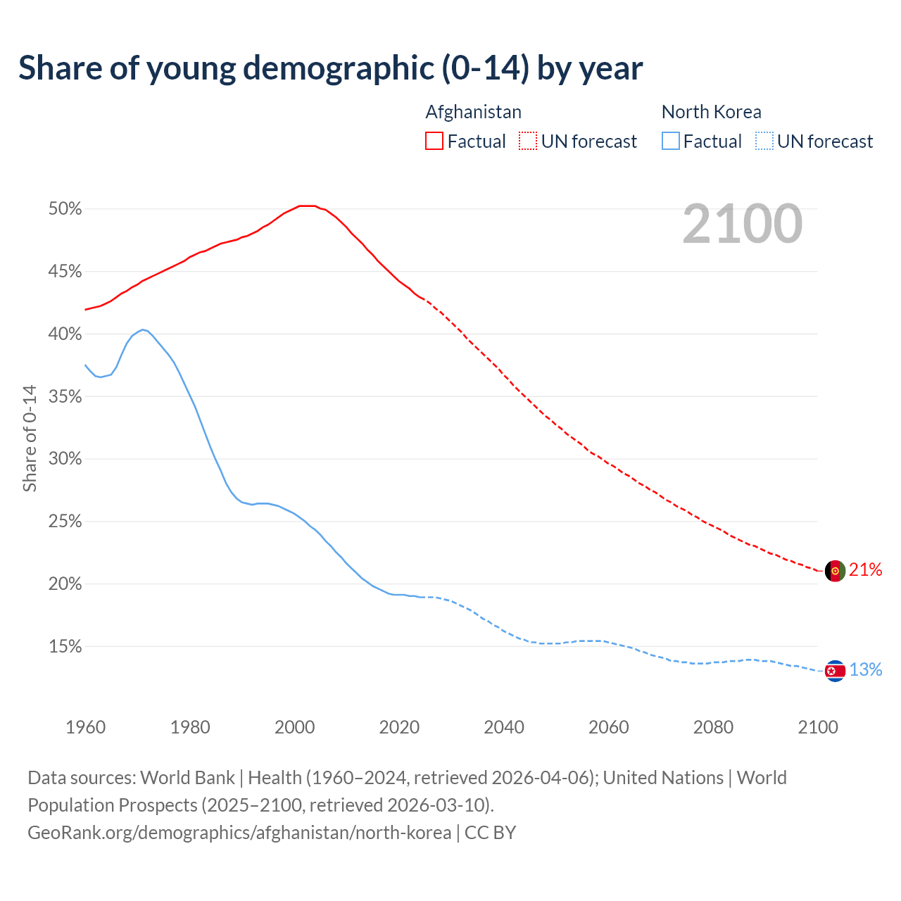 - The share of young demographic (0-15 years old) in Afghanistan is 42.9% vs 18.9% in North Korea.