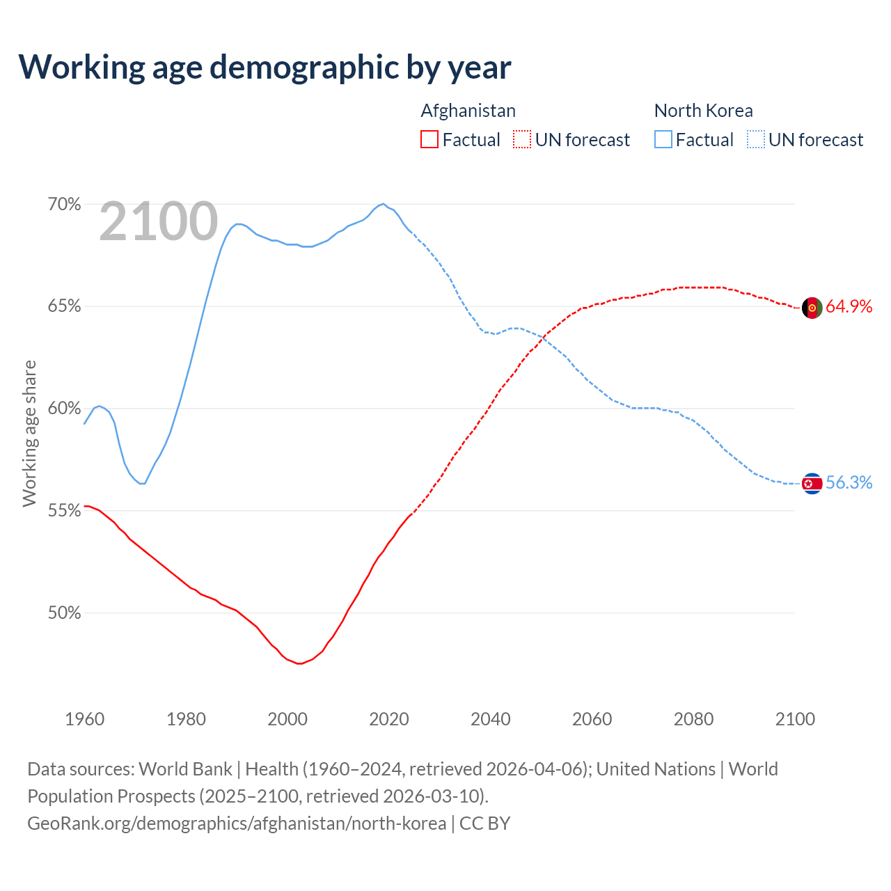- Afghanistan has 24.8M working age adults (aged 15-64) vs 18.3M in North Korea.