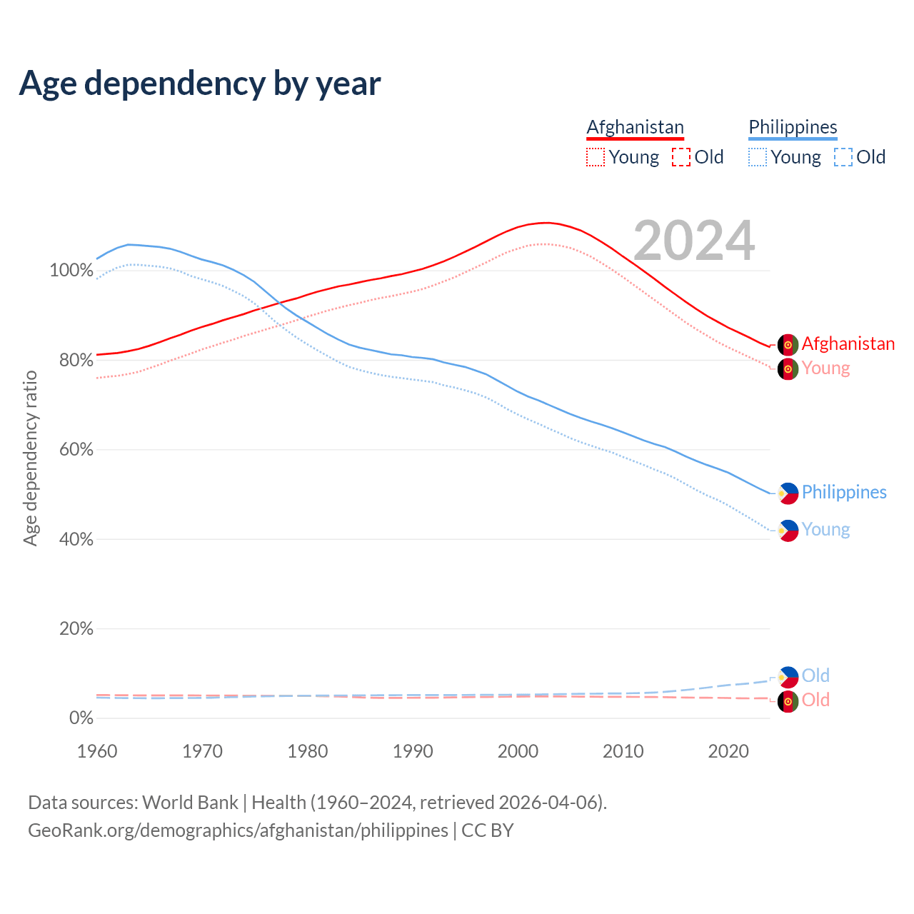 Data sources: World Bank | Health (1960–2024, retrieved 2026-04-06); U.S. Census Bureau (1960–2024, retrieved 2026-02-08).