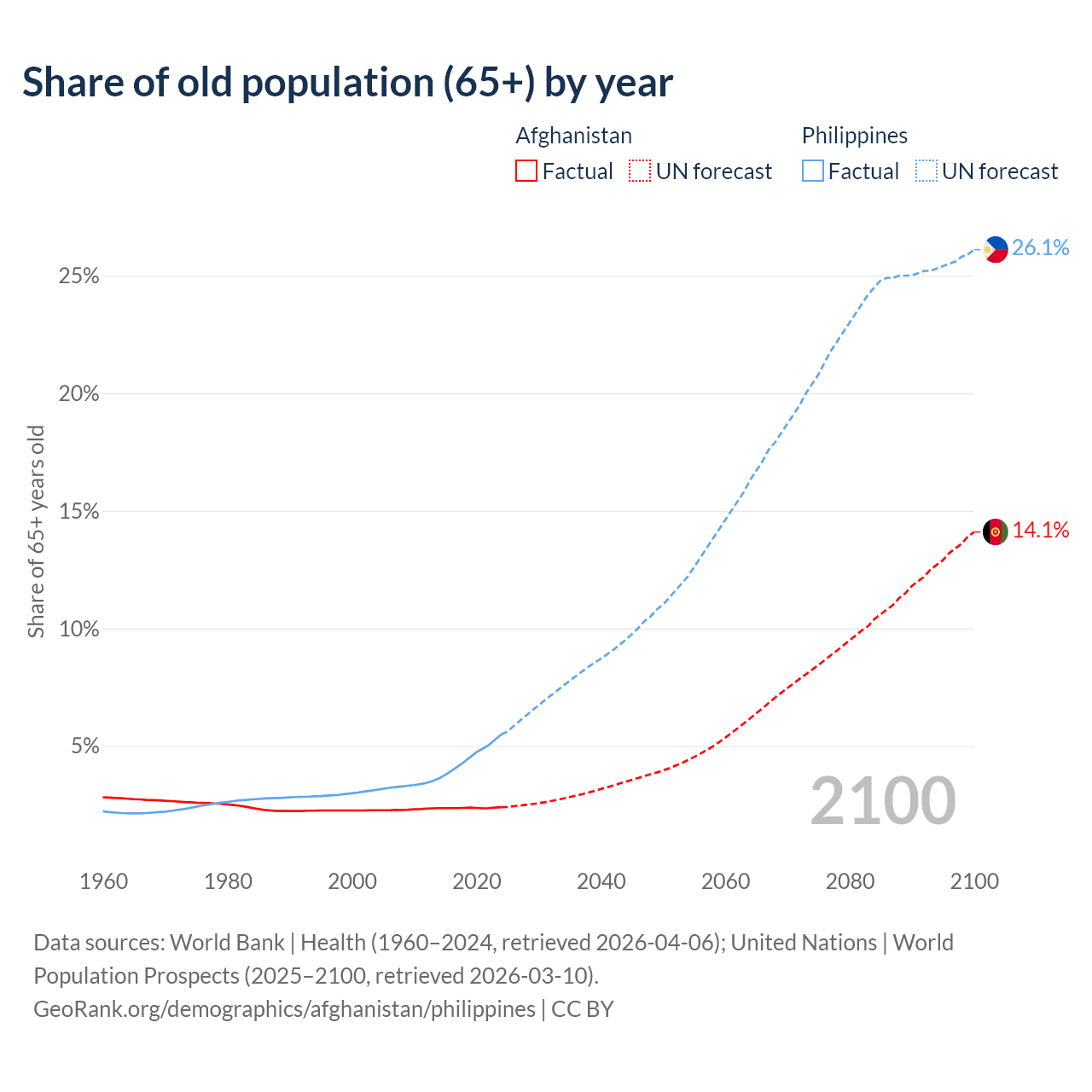 The share of older people aged 65 and over is 2.4% in Afghanistan and 5.49% in the Philippines. Life expectancy in Afghanistan compared to the Philippines .